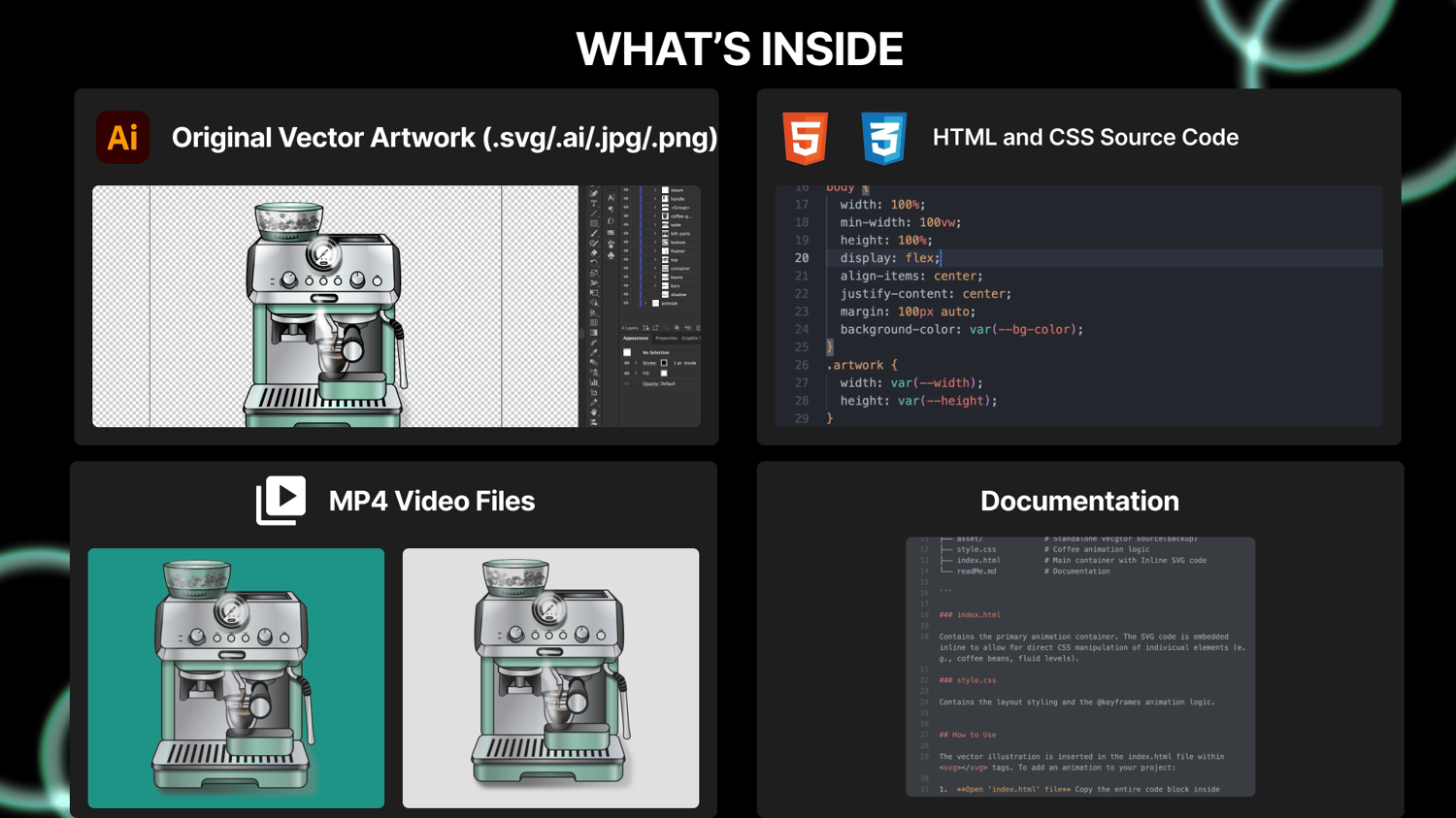 Bring your digital interface to life with more than just a static image. This premium motion graphics bundle is designed for developers and designers who want to add a touch of "digital caffeine" to their projects. Whether you're building a cafe landing page, a loading screen for a food app, or a social post design, this bundle provides the perfect blend of high-end vector art and subtle, lightweight animation.