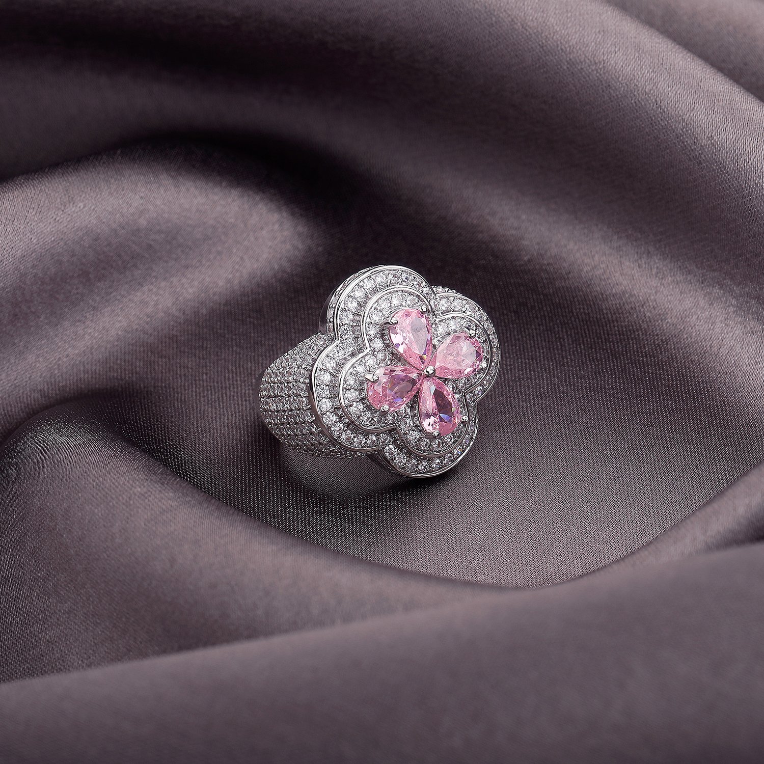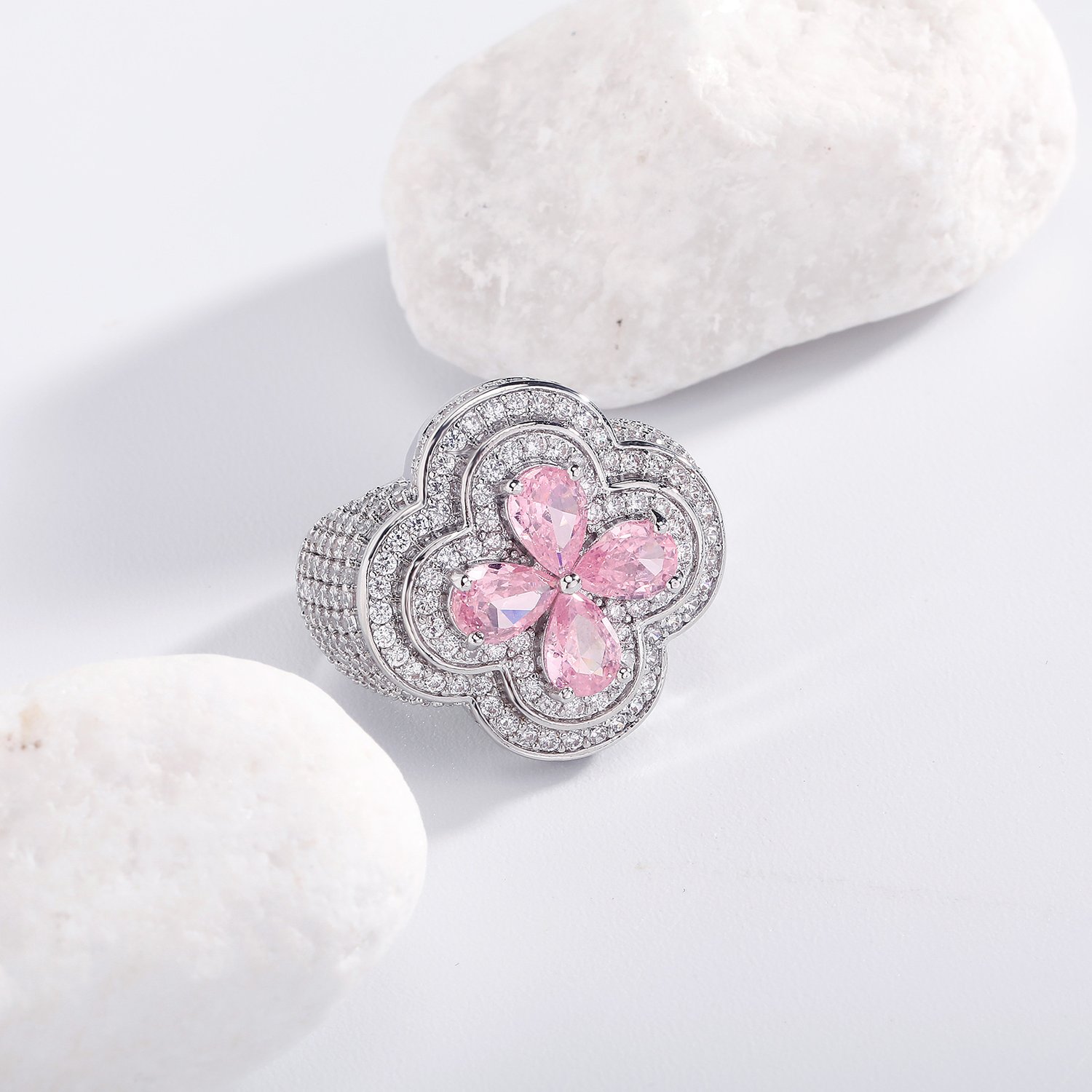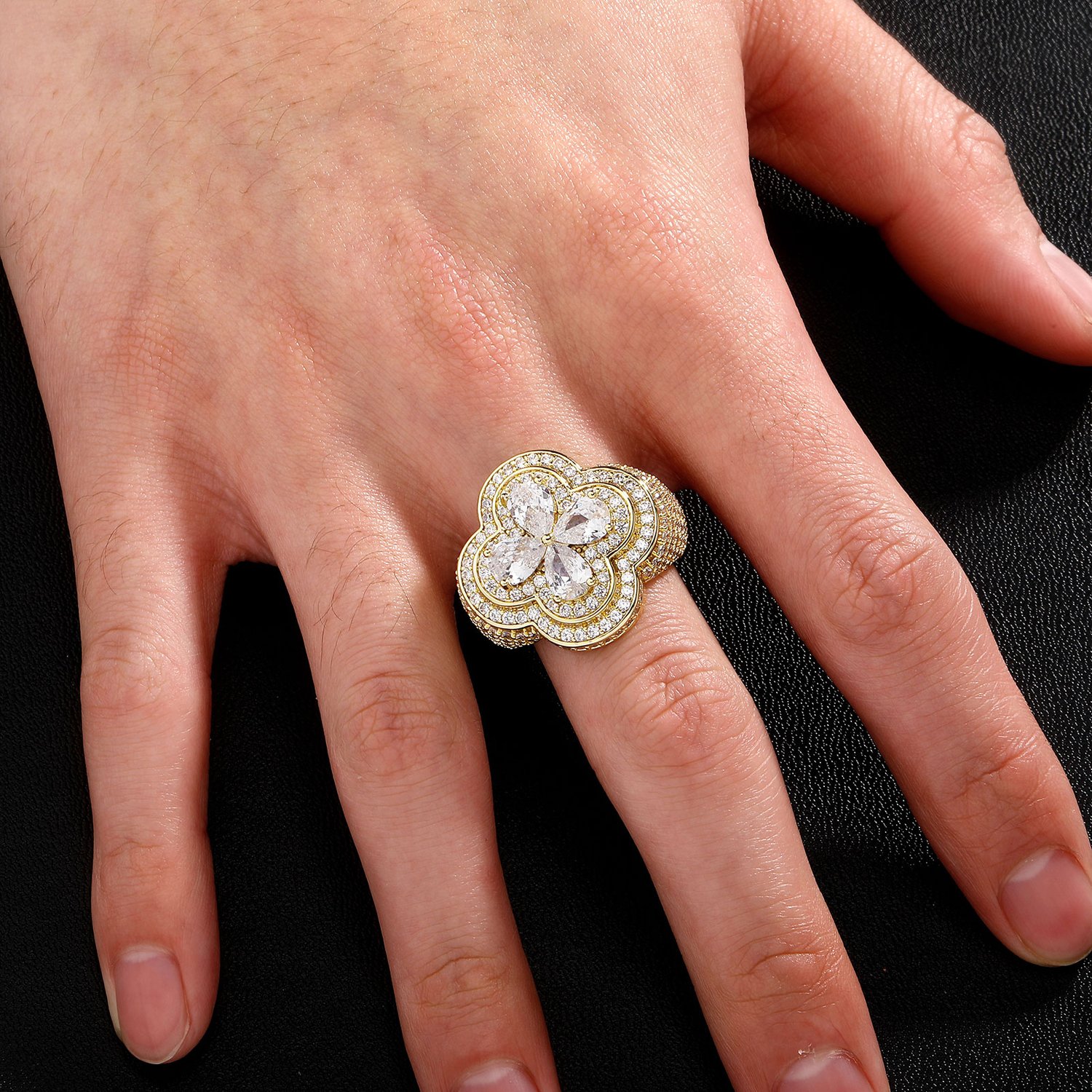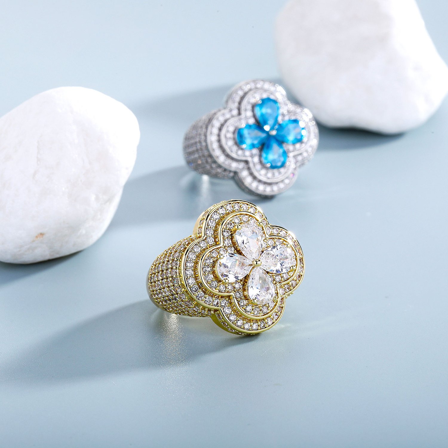 Stand out with this iced out colorful four leaf flower ring, designed for both men and women who love bold fashion. Featuring vibrant micro paved cubic zirconia stones, this ring brings serious bling and shine to any outfit. The unique four-leaf flower design adds a playful, eye-catching touch, perfect for punk, hip hop, or streetwear styles.