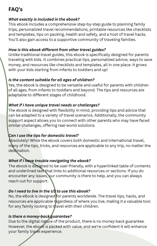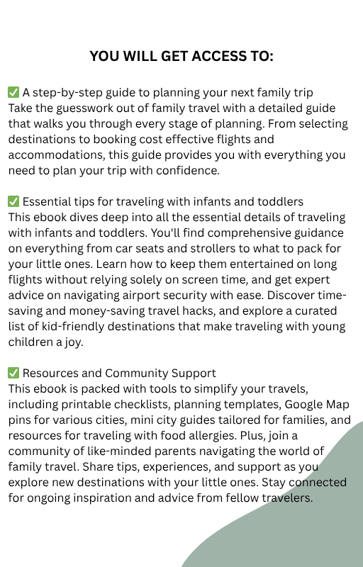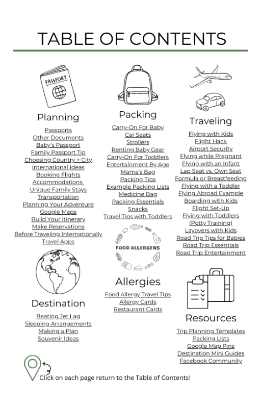 <p>80+ pages of real, practical advice for every stage — from your baby's first passport to surviving long haul flights, road trips, and everything in between.</p>