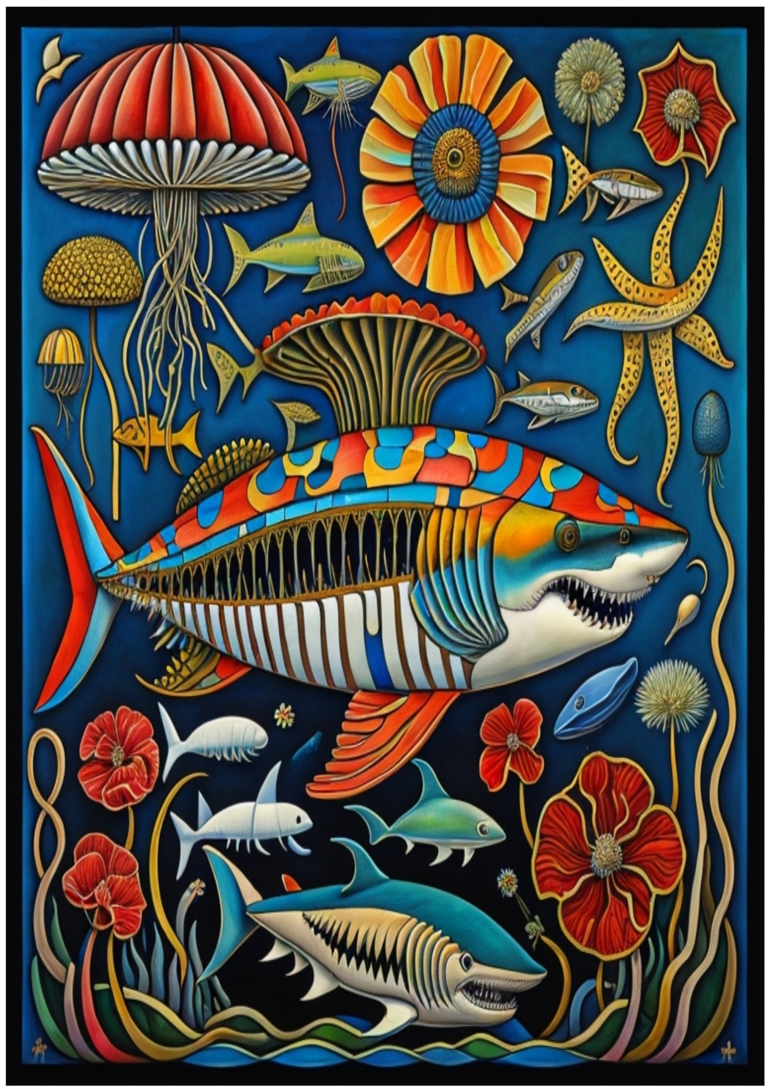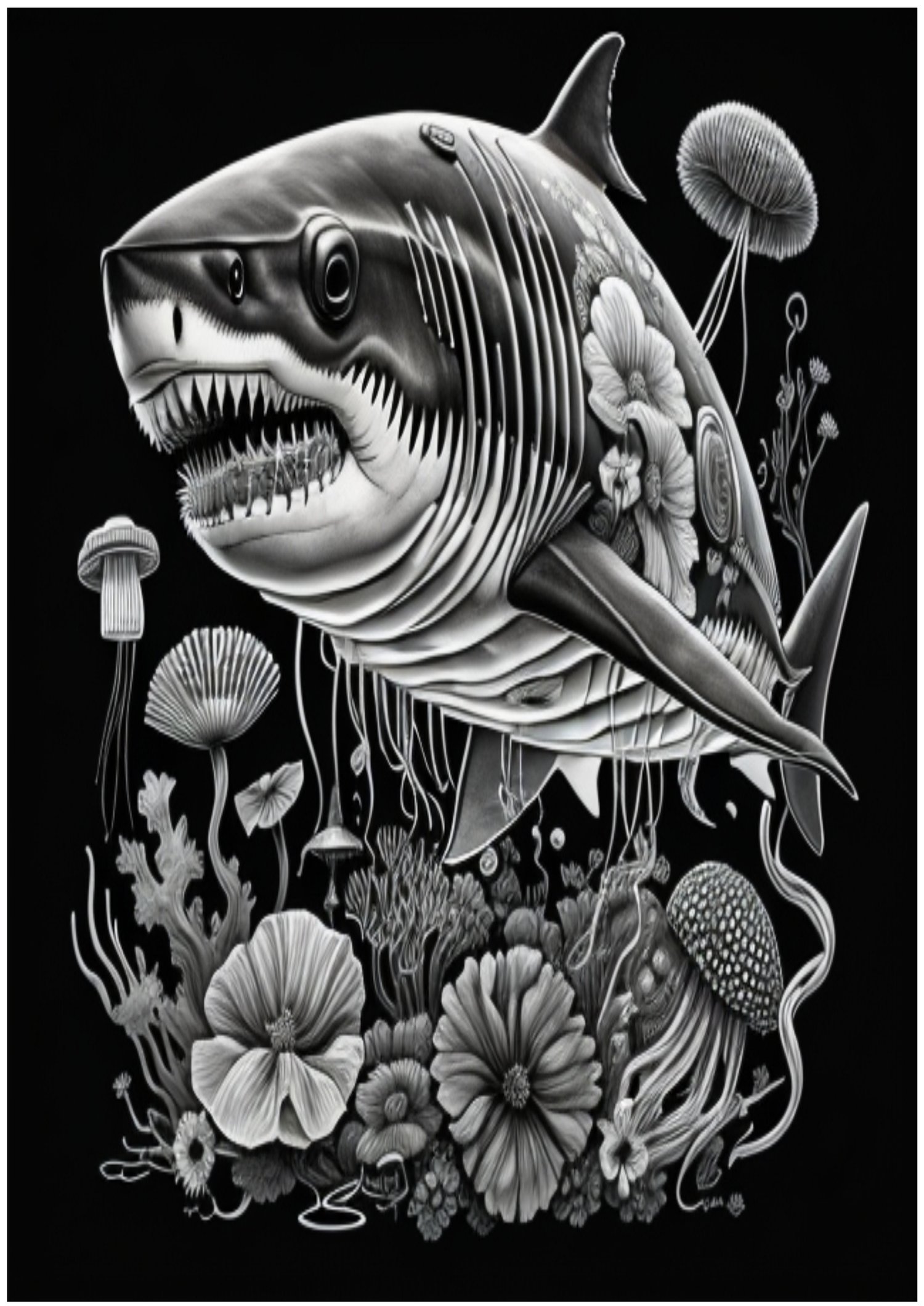 30 printable full-color art posters inspired by an idea of a shark-modeled submarine.