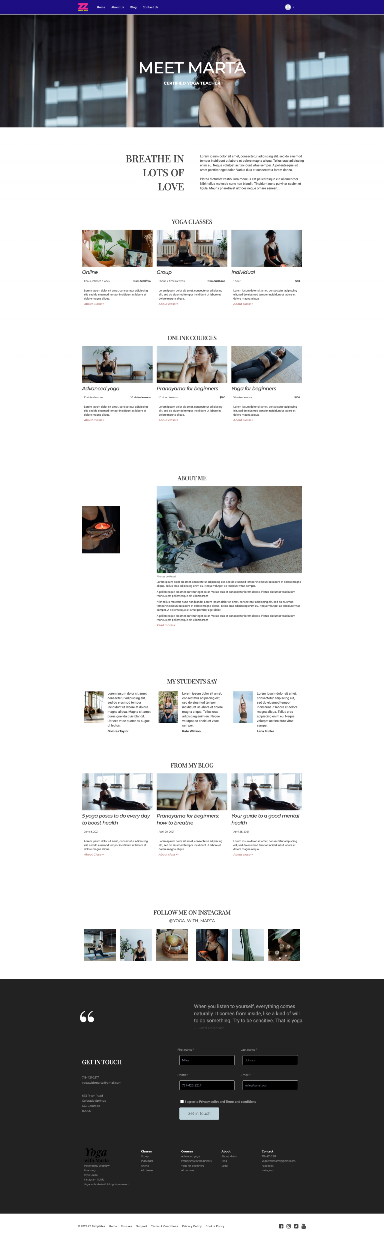 Discover inner peace with the Yoga Instructor Landing Page template. Ideal for yoga teachers, this template features sections for class descriptions, online courses, testimonials, blog posts, and instructor bio.