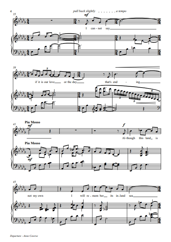 Departure uses polytonality and changing modalities to provoke different images and reflections of the short, highly evocative poem by Anna Akhmatova.