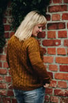 The pullover is worked seamlessly from the bottom up. The entire body is worked in cable pattern based on simple 3/3 cables. Front and back are divided at armholes and shaped separately then joined at the shoulders. Stitches are picked up around the neck which is then finished with a neckband. Finally, the stockinette sleeves with ribbed cuffs are worked in the round.