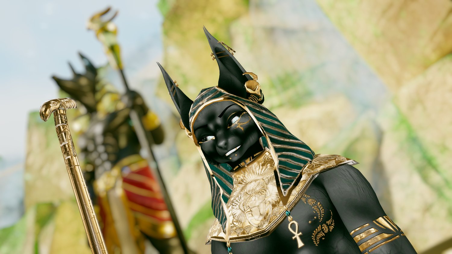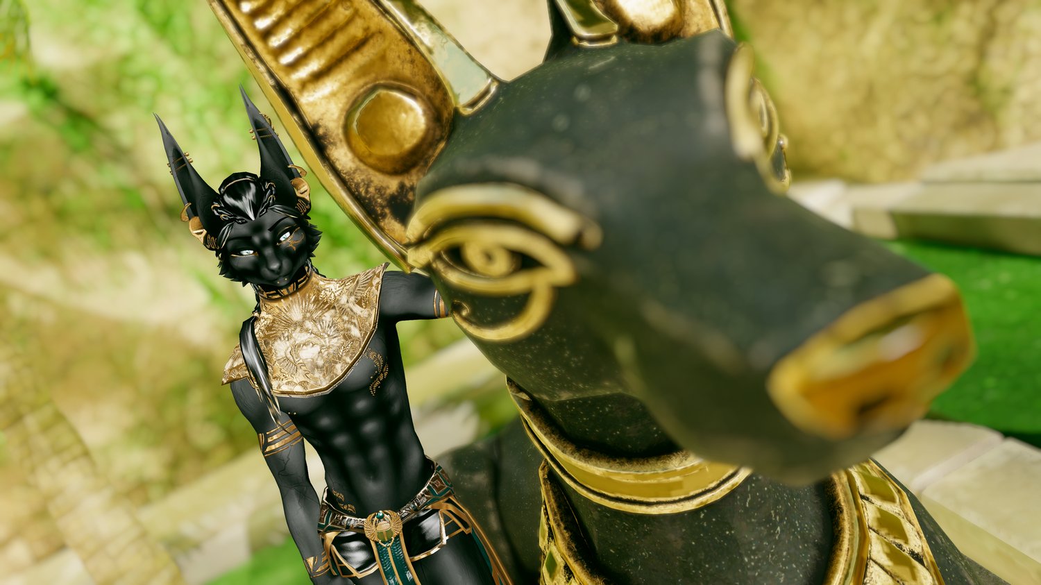 All bandages, hair, the skirt, mask, collar, hood, pants/panties, jewelry, earrings, piercings, rings, ankh, Sistrum, Was scepter, heart, heart particles, tail and all the textures to it are made from scratch by me in Blender and Substance Painter.