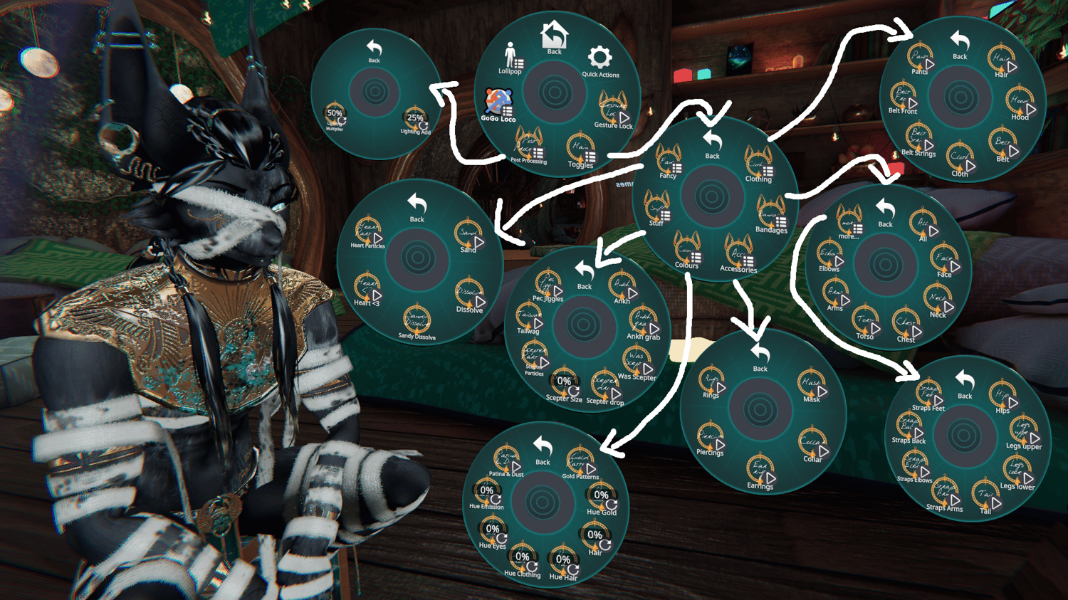- hue radials and colour adjustments: hair emission hue, gold pattern toggle and hue, clothing hue, hair radial from black to white, eyes hue, toggle for patina and smudged dust on fur