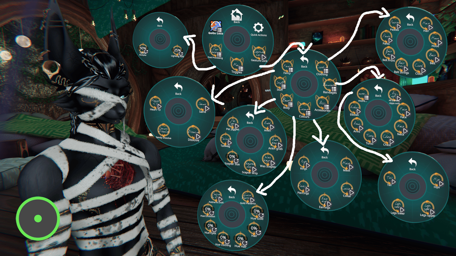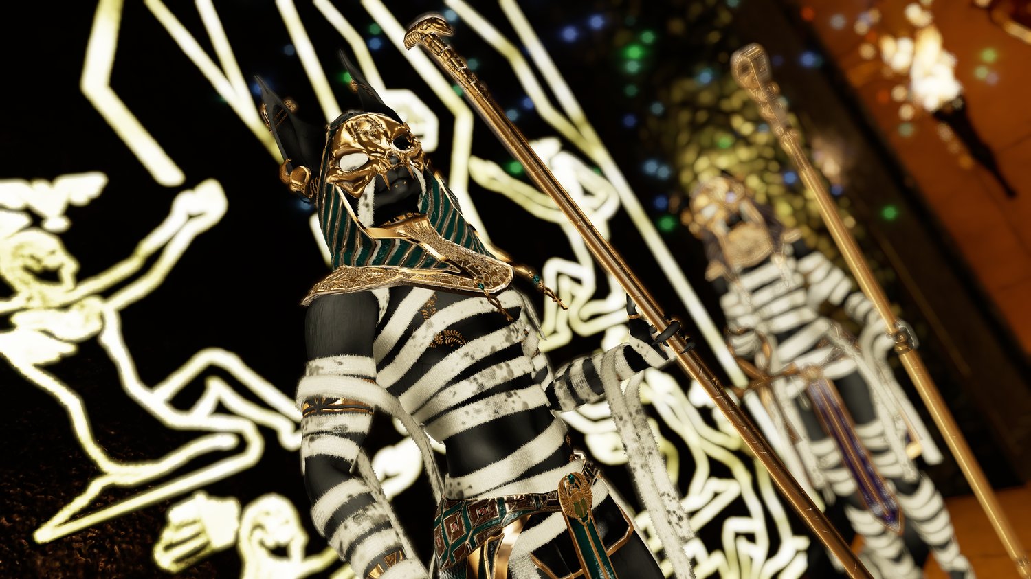- dissolve toggles for all bandages (face, upper chest, neck, torso, hips, upper legs, lower legs, upper arms, lower legs, straps on lower legs, straps on back, straps on arms, straps on elbows), mask, hood, skirt (cloth belt, strings, cloth in front, cloth in back), pants/panties, collar, earrings, piercings, rings, Ankh, Was scepter