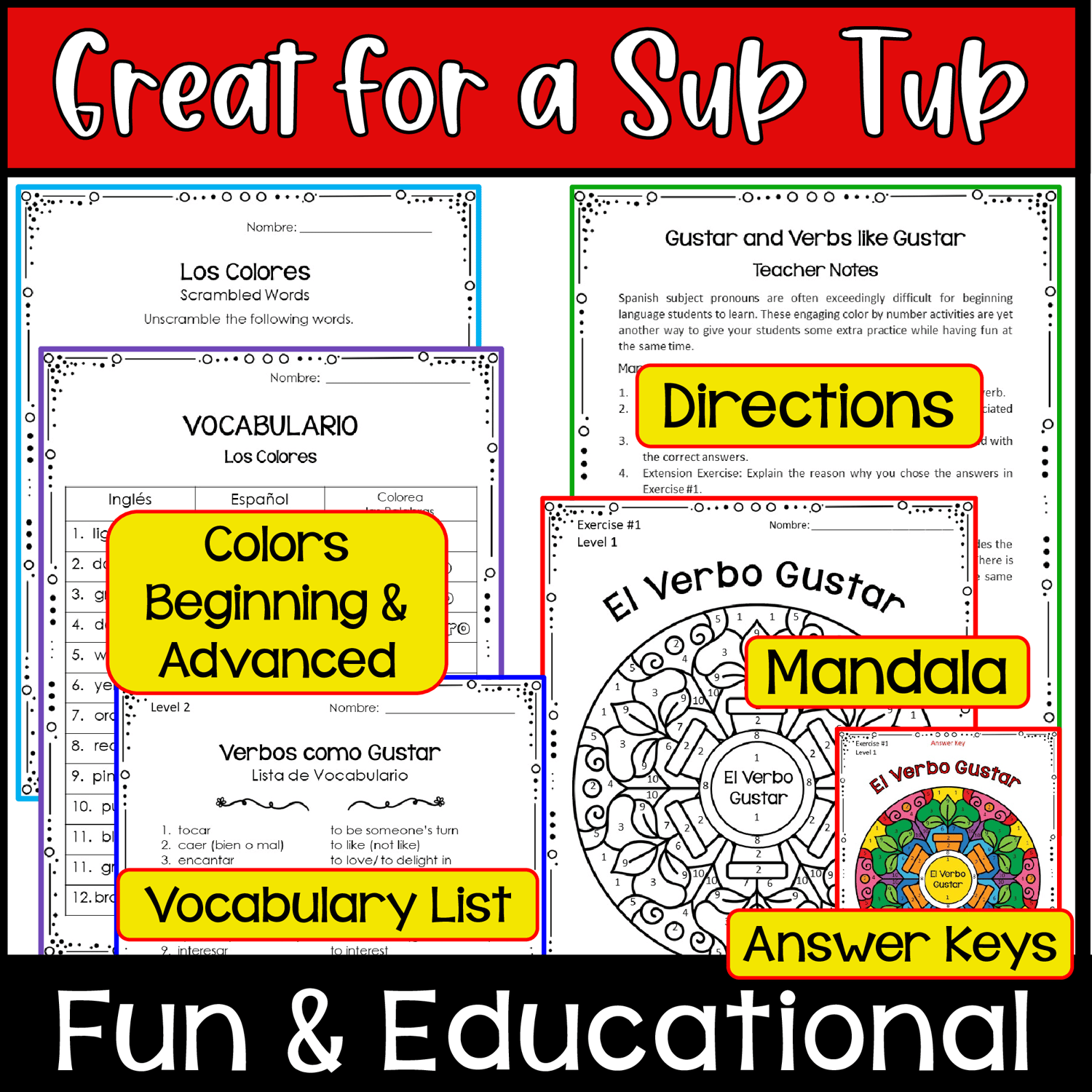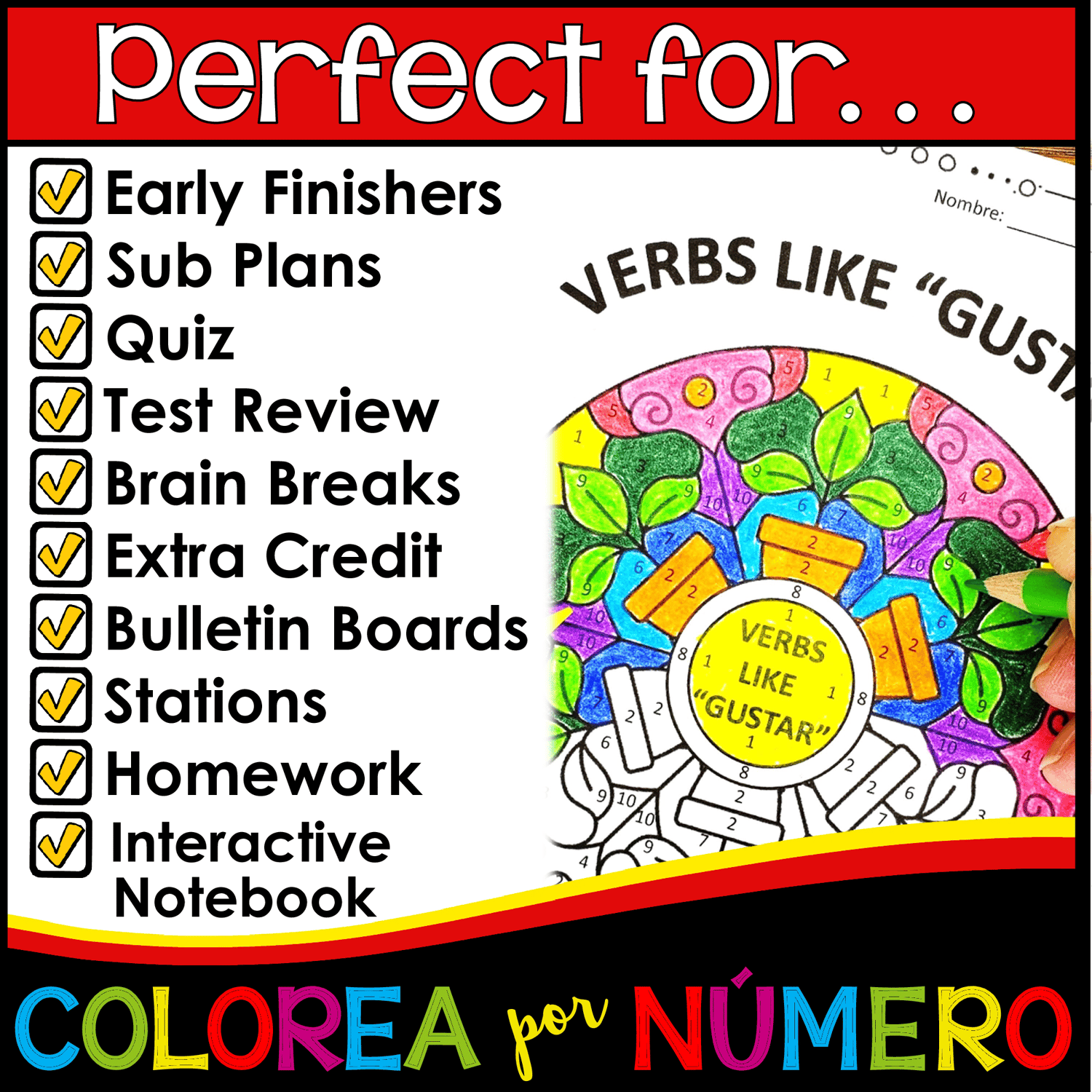 Spanish Verbs like Gustar Worksheets - Color by Number Activities - Sub Plans