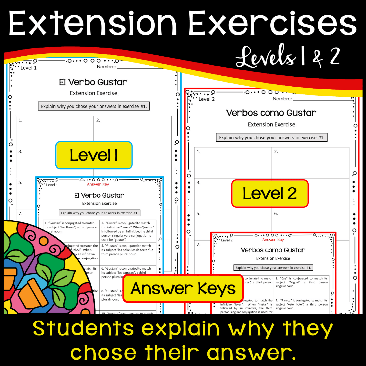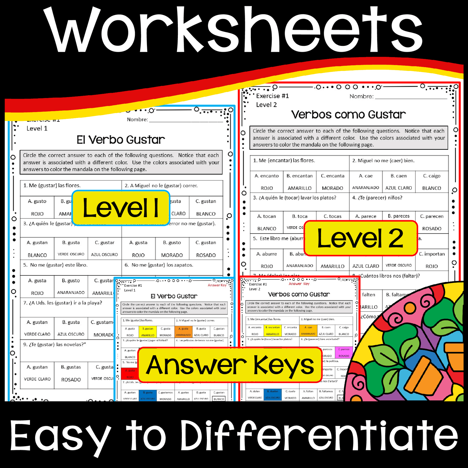 - Multiple-choice worksheets for gustar & verbs like gustar (Levels 1 & 2)