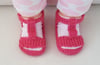 These 4ply garter stitch baby sandals have a buttoned ankle strap, foot strap knitted sideways and optional T-bar. This style of sandal is also available in 3ply and 8ply.