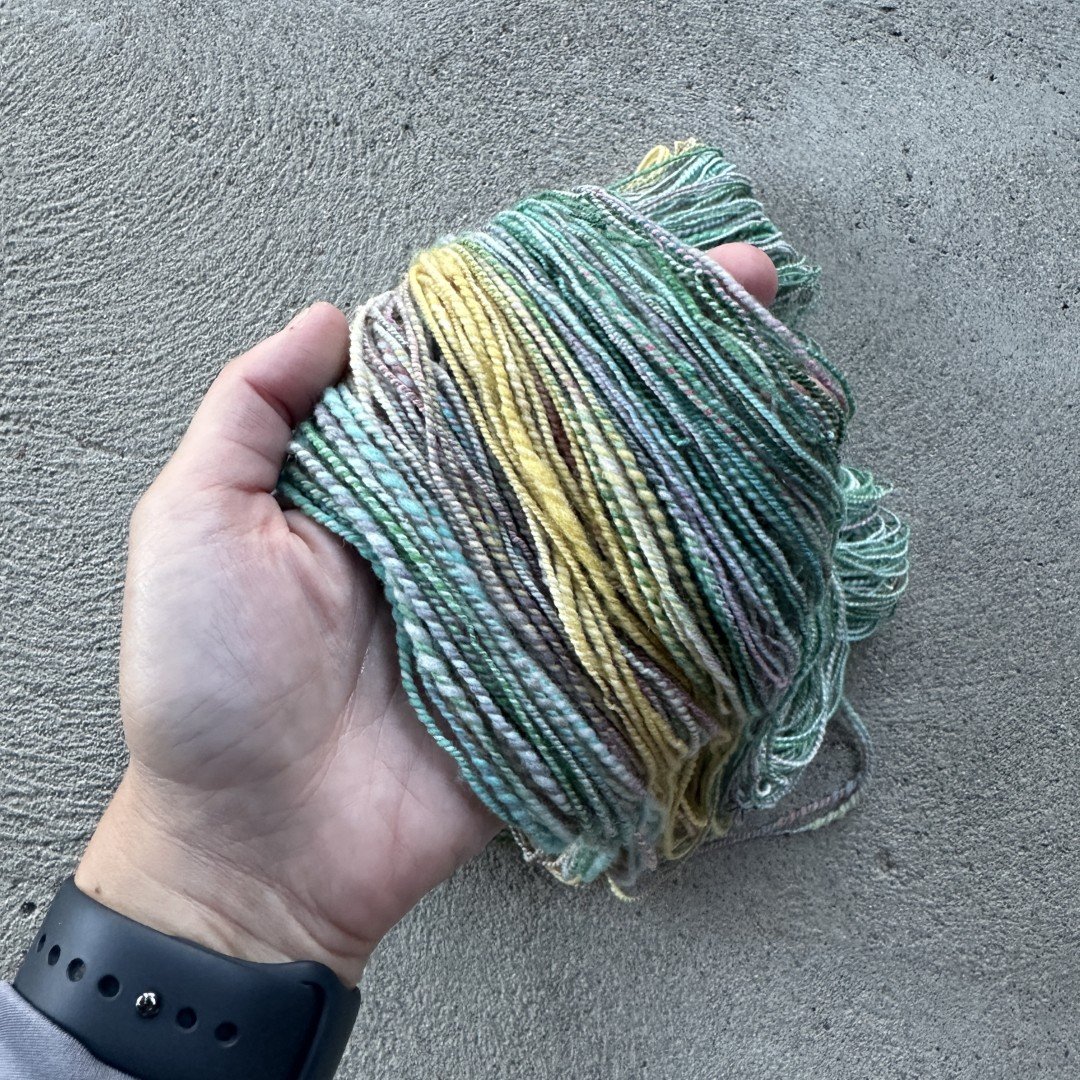 2-ply fractal handspun yarn, 100% Rambouillet fiber by Lavender Lune Yarn Co. www.lavenderluneyarn.co. Sample used 227 yd / 208 m (65 g), colorway Lemonade.