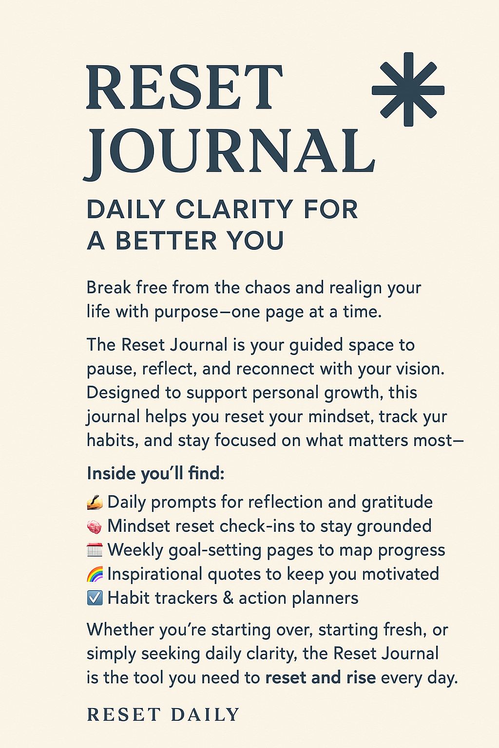 7 Days to Reset Your Mindset A Free Journal by Reset Daily | Created by Jay Singh 🌟 Overview Welcome to your 7-day reset. Each day includes a quote, a powerful reflection prompt, space for gratitude, and a simple action step to realign your mindset and energy. Let’s begin.