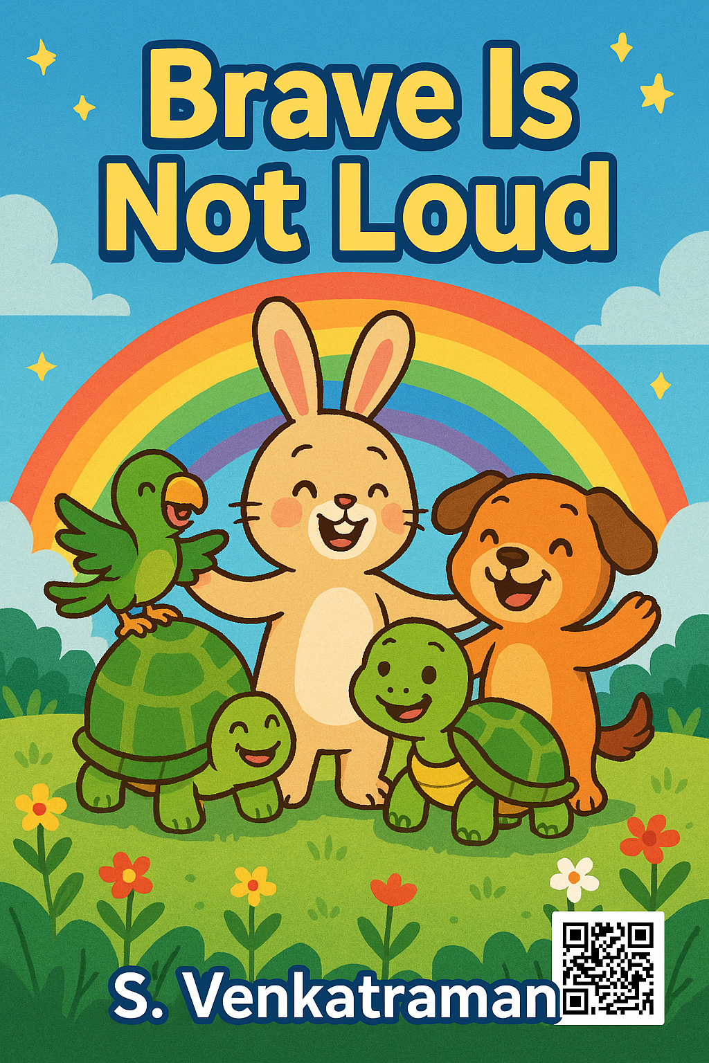 - Illustration Prompt: Bright meadow with Bunny, Puppy, Turtle, and Parrot under a rainbow. Title in bold: Brave Is Not Loud. Author: S. Venkatraman.