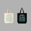 This playful typography design says “Sorry I’m late, I didn’t want to come” — perfect for shirts, mugs, tumblers or totes when you’re feeling a little extra snarky. Features a mix of elegant script and bold caps, accented with cute hearts and sparkles in soft lavender and teal.