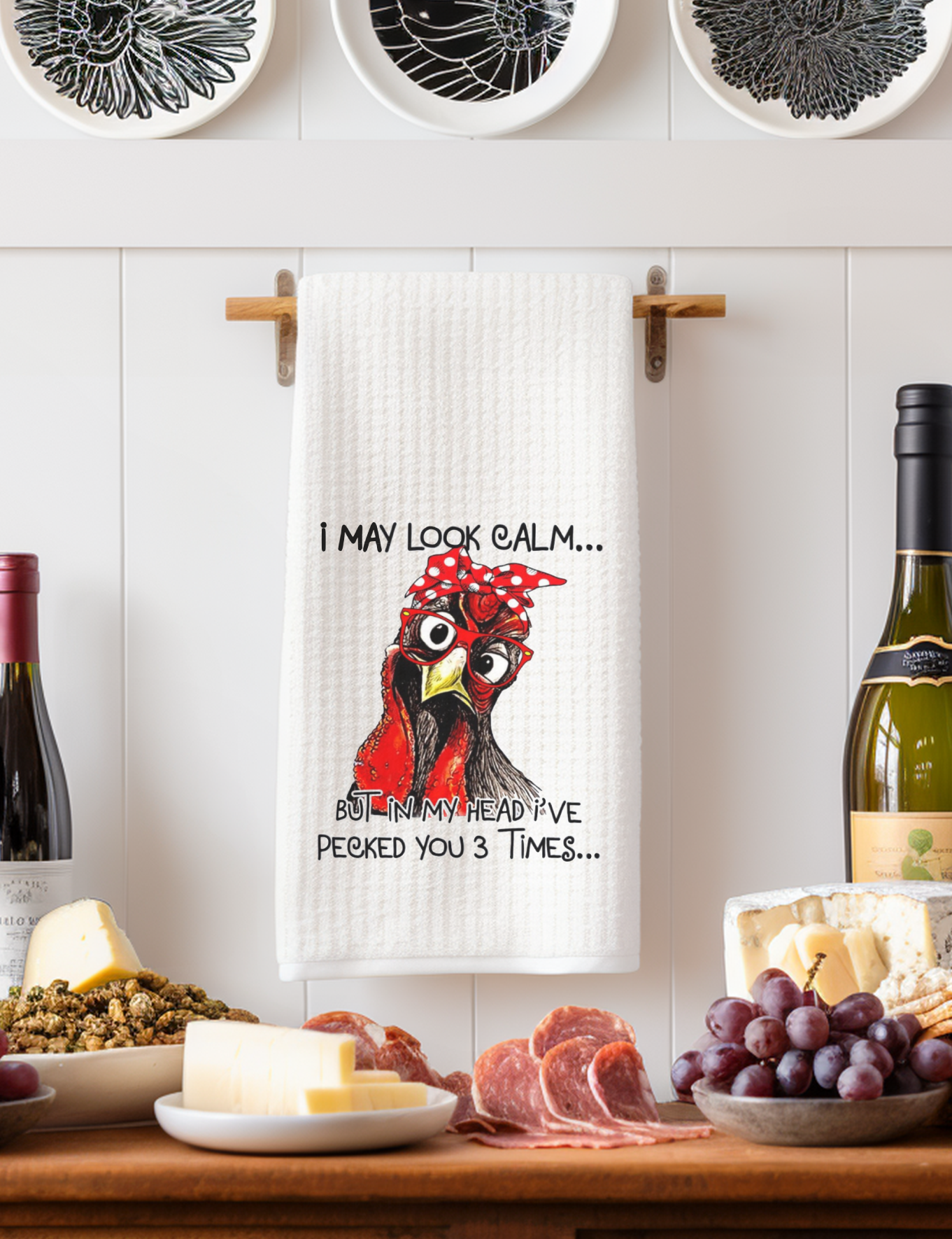 Add a touch of humor and farmhouse charm to your kitchen with this cheeky chicken-themed waffle dish towel! Featuring a sassy red-bandana chicken and the playful phrase “I may look calm… but in my head I’ve pecked you 3 times”, this towel is sure to get a laugh while being super practical.