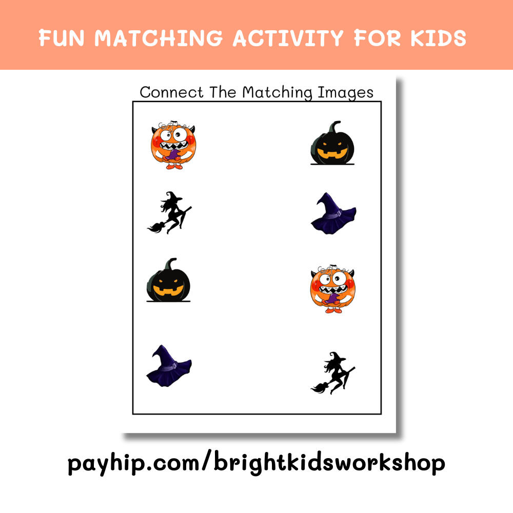 This listing features Fun Halloween Matching Images Printables—learning worksheets for kids! Designed for preschoolers, this fun activities include 1 pdf worksheets that your children will enjoy. They cover learnig the different images with a festive twist. Perfect for home use or as part of school centers, these worksheets are ideal for preschool, kindergarten, and first-grade students.