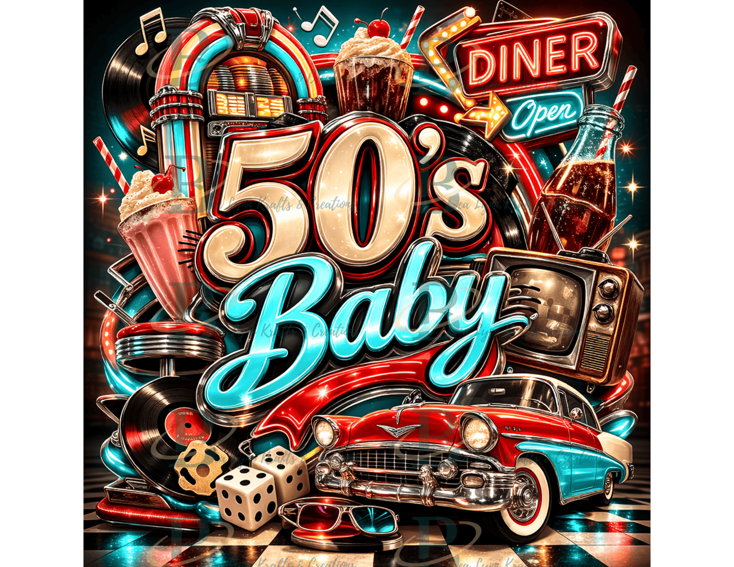 Bring the rock & roll era of the 1950s to life with this bold “50’s Baby” retro chrome design! Featuring shiny vintage lettering surrounded by classic 50s nostalgia like a jukebox, vinyl records, soda bottles, milkshakes, neon diner signs, retro television, and a classic 1950s car. The bright chrome, turquoise, and cherry red colors capture the fun energy of the iconic American diner culture.