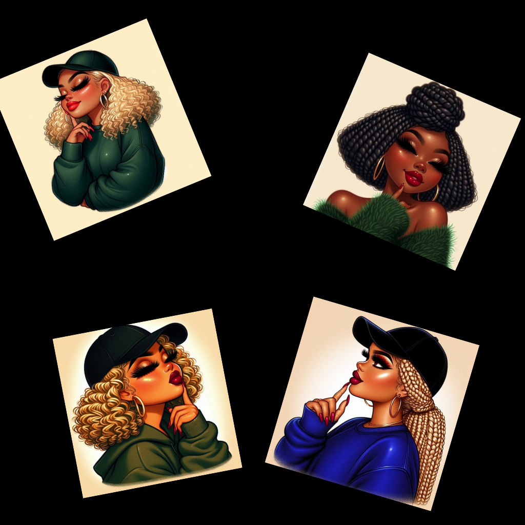 A collection of high-quality AI-generated images featuring stylish women in trendy outfits, unique hairstyles, and confident poses. Each design focuses on fashion, attitude, and clean detail—perfect for modern, eye-catching visuals.