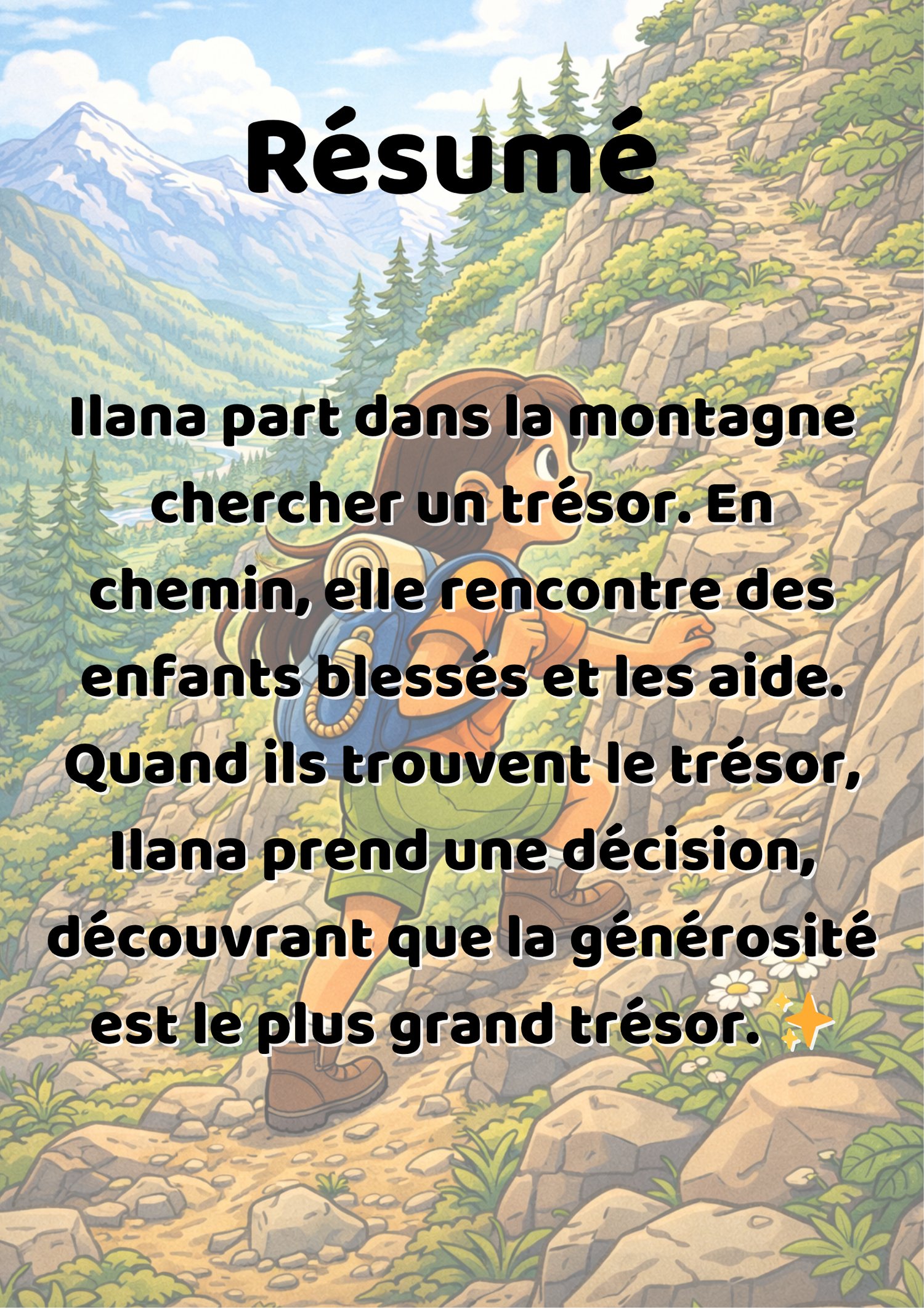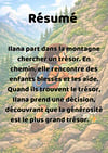 Ilana part dans la montagne chercher un trésor. En chemin, elle rencontre des enfants blessés et les aide. Quand ils trouvent le trésor, Ilana décide de le partager avec eux, découvrant que la générosité est le plus grand trésor.