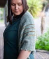 It is worked in fingering weight / 4ply wool and the narrow asymmetrical triangle shape is worked form the narrow tip to the wide end that features a bobbled bind off.