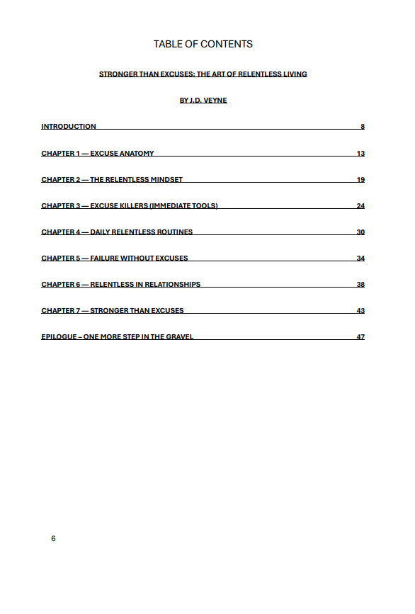 Stronger Than Excuses: The Art of Relentless Living is a clear, practical guide to breaking excuses and building consistency. Instead of waiting for motivation, you’ll learn to start small, carry routines through chaos, and keep moving even when conditions aren’t perfect.
