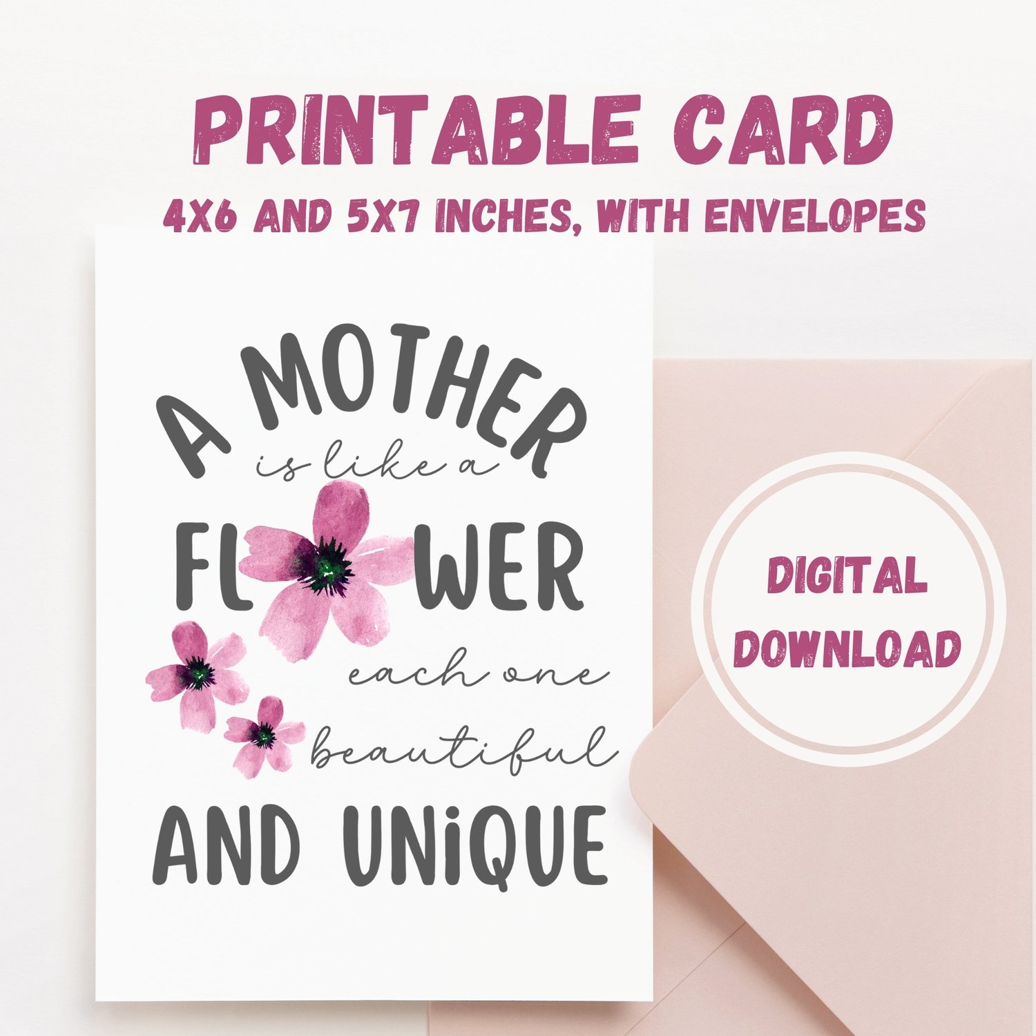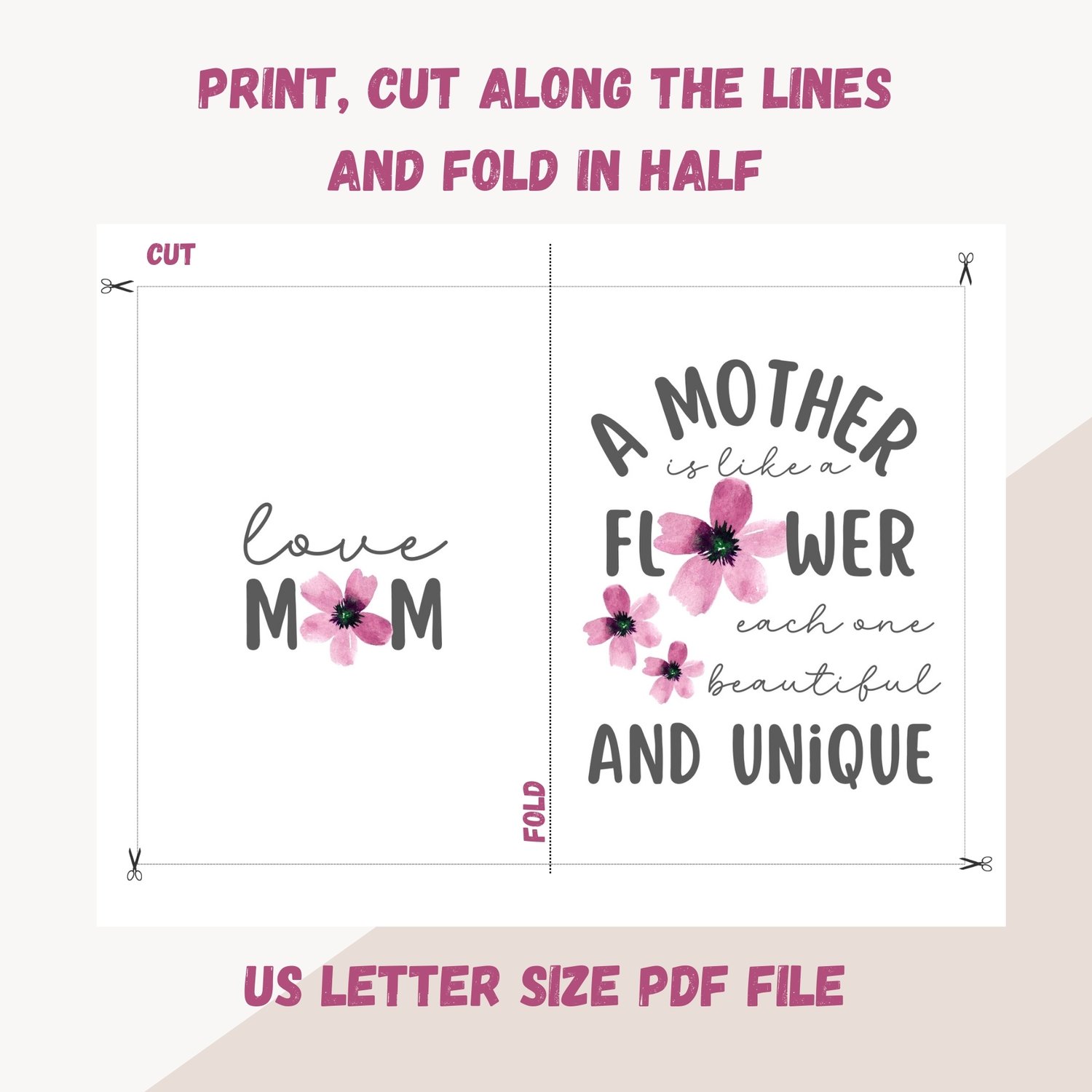 Express your love for Mother's Day of Mom's birthday with this simple yet beautiful printable card featuring a heartfelt quote and simple watercolor flower design. Perfect for daughters, sons, or anyone celebrating the best mom in their life. Get instant access to this digital card, ideal for those seeking a meaningful yet convenient way to show appreciation. Make this Mother's Day or birthday memorable with a thoughtful gesture that speaks volumes. Download now and let your mom know just how much she means to you.