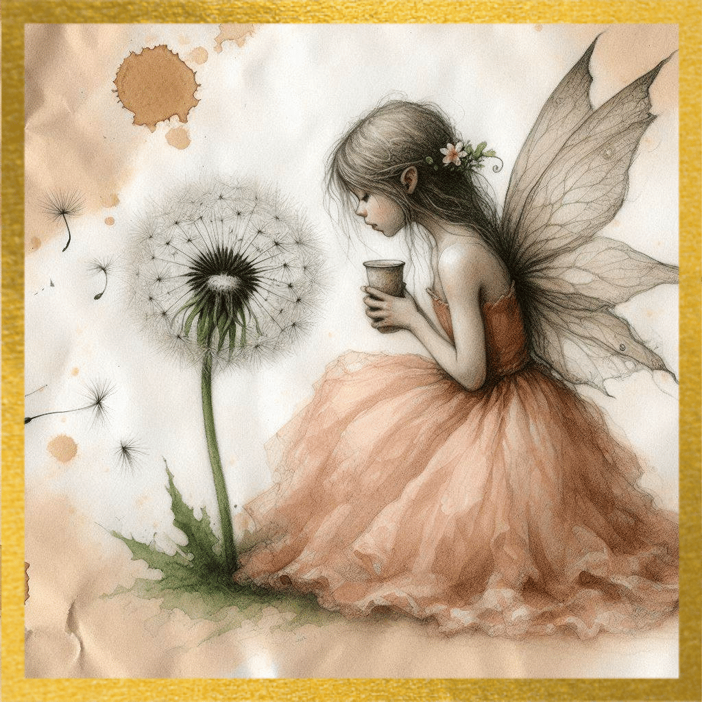 A delicate fairy cradles a dandelion puff in this dreamy watercolor & pencil sketch. Soft peach tones, drifting seeds, and vintage textures create a magical, fairycore-inspired artwork. PNGs and PDF file in 1024 X 1024 format are perfect for prints, wall decor, and creative projects!