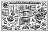 • Themes include trophies, finish lines, pit stop action, monster trucks, and cute race cars
