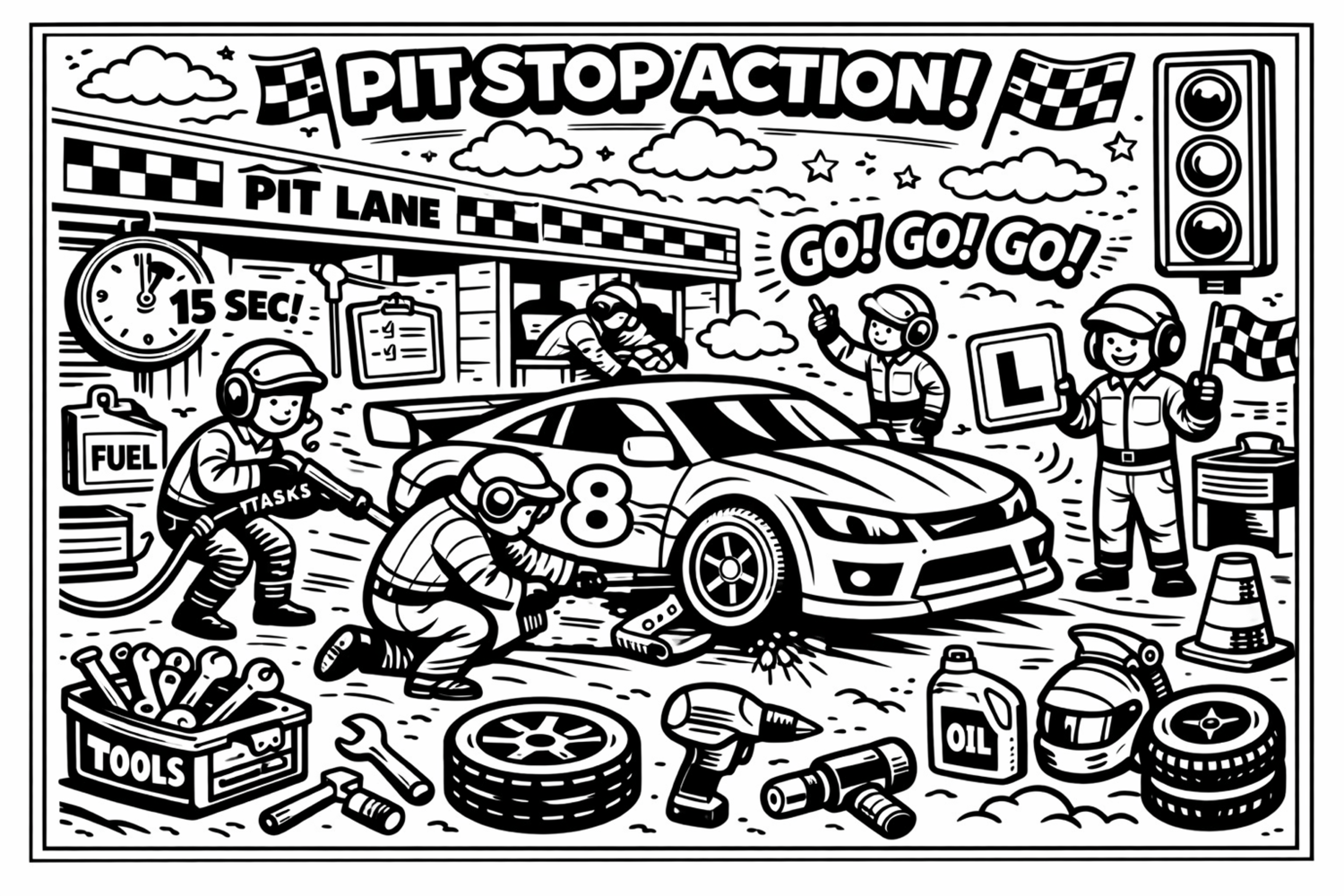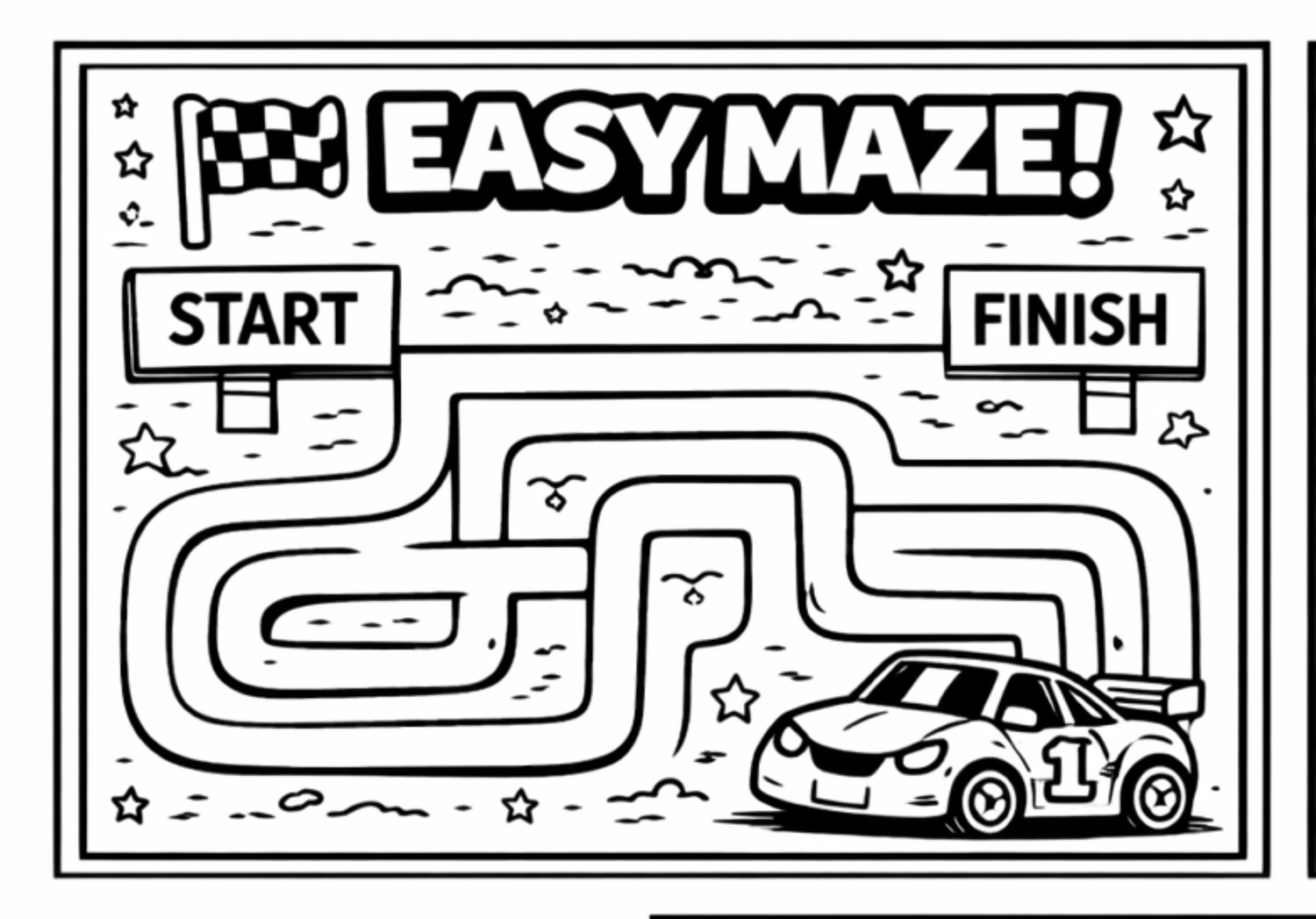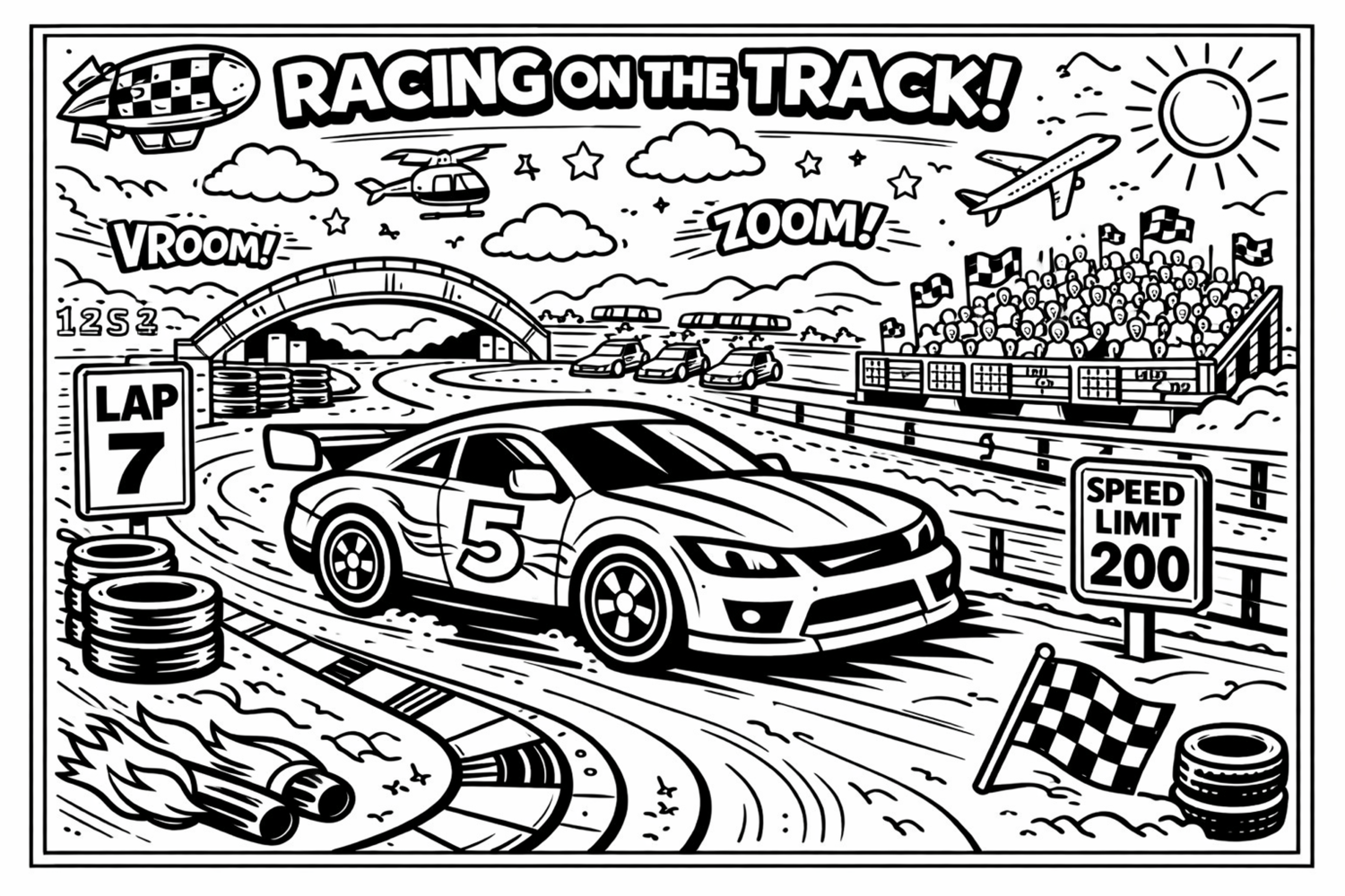 Kids will love coloring exciting racing scenes and completing a simple maze activity!