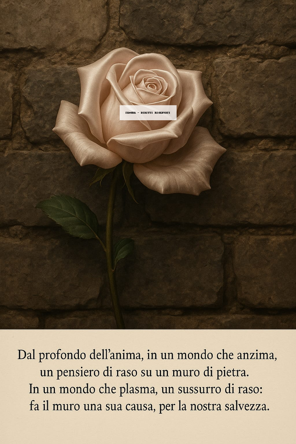Questa cartolina digitale celebra la forza interiore con versi d’autore: "Dal profondo dell'anima, in un mondo che anzima, un pensiero di raso su un muro di pietra. In un mondo che plasma, un sussurro di raso: fa il muro una sua causa, per la nostra salvezza." Perché è speciale: