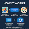 - Pick a city, state, or landmark → get the 3-word location code → design your entire scene with mood, time of day, subject, emotion, and color.