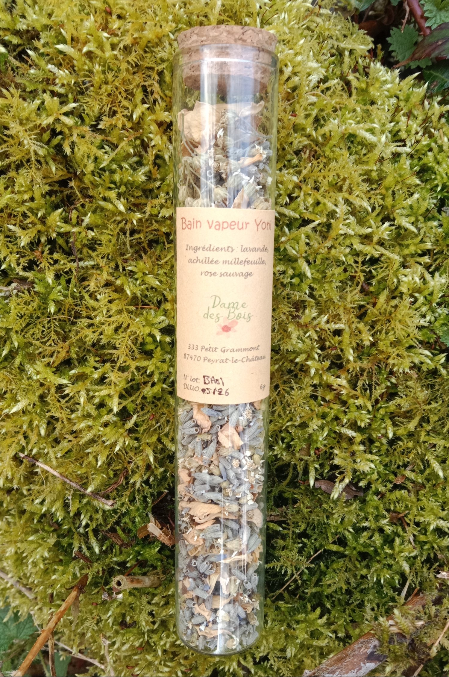 Composition : Lavande (cicatrisante, antiseptique, antibactérienne, antifongique, apaisante et régulatrice du système nerveux), achillée millefeuille (grande cicatrisante de la mémoire utérine, anti-inflammatoire et circulatoire, régule les déséquilibres du cycle), rose (aide à renouer avec son corps, sa sensualité, sa créativité, sa sexualité, apporte de la douceur sur les mémoires difficiles)