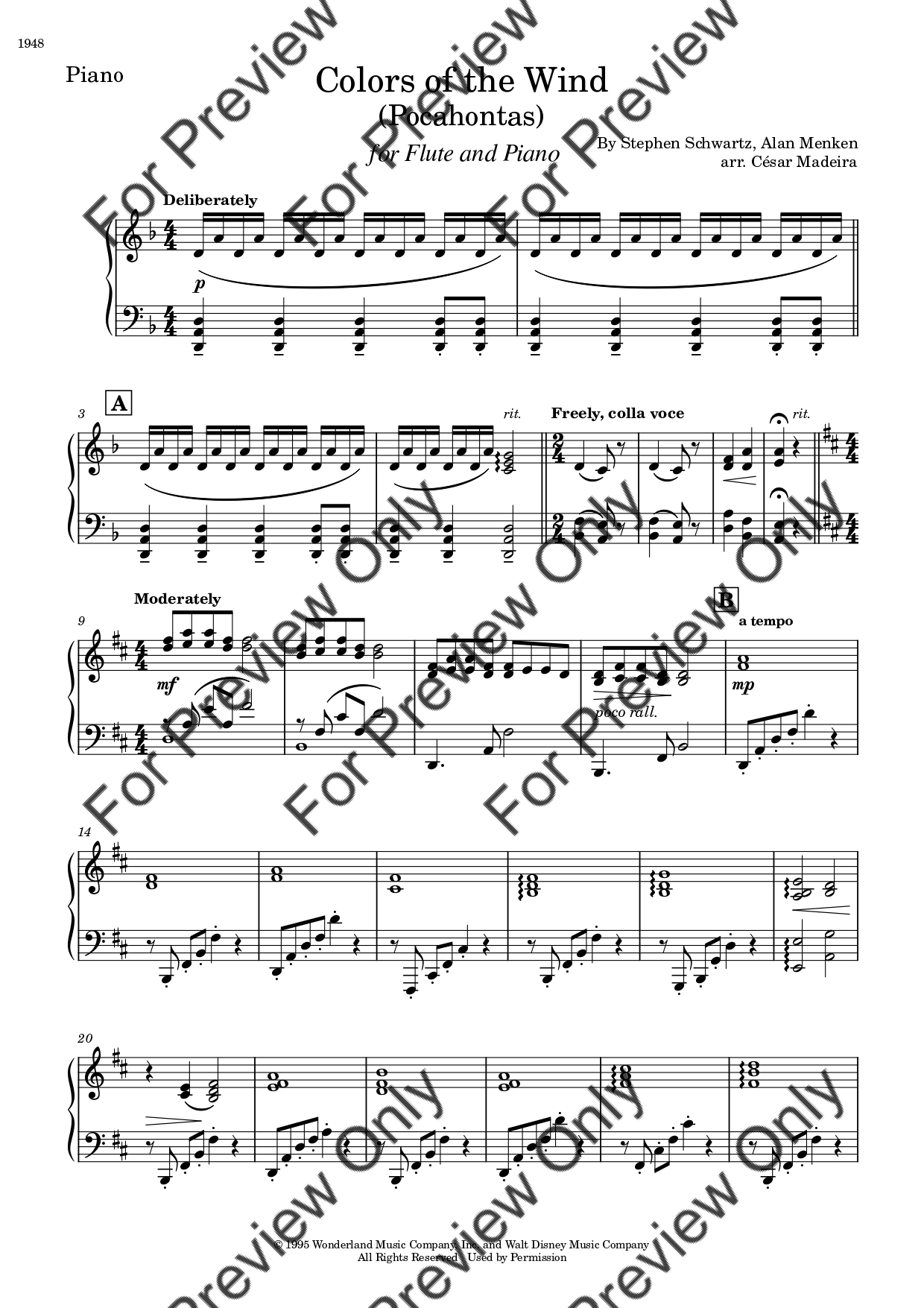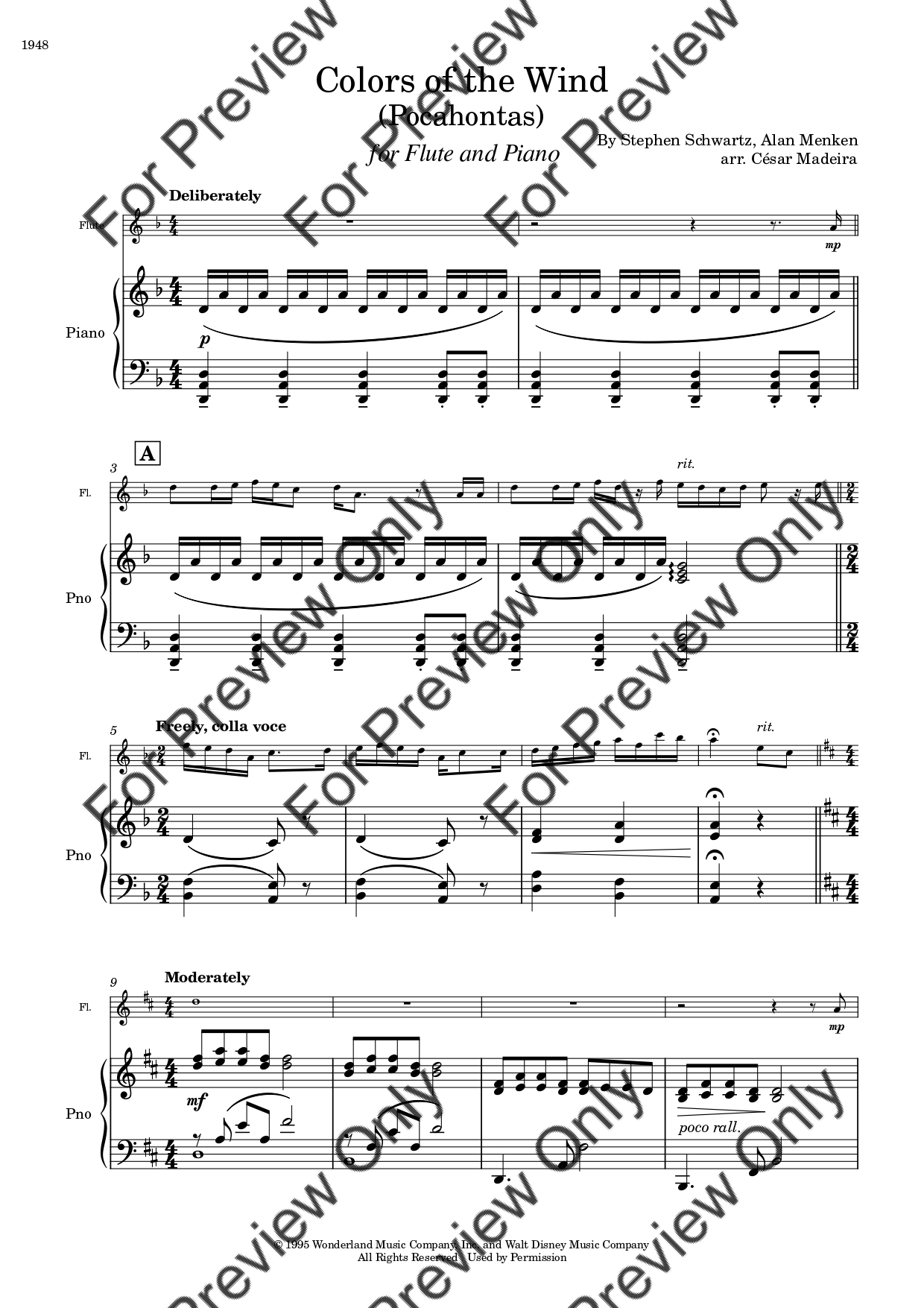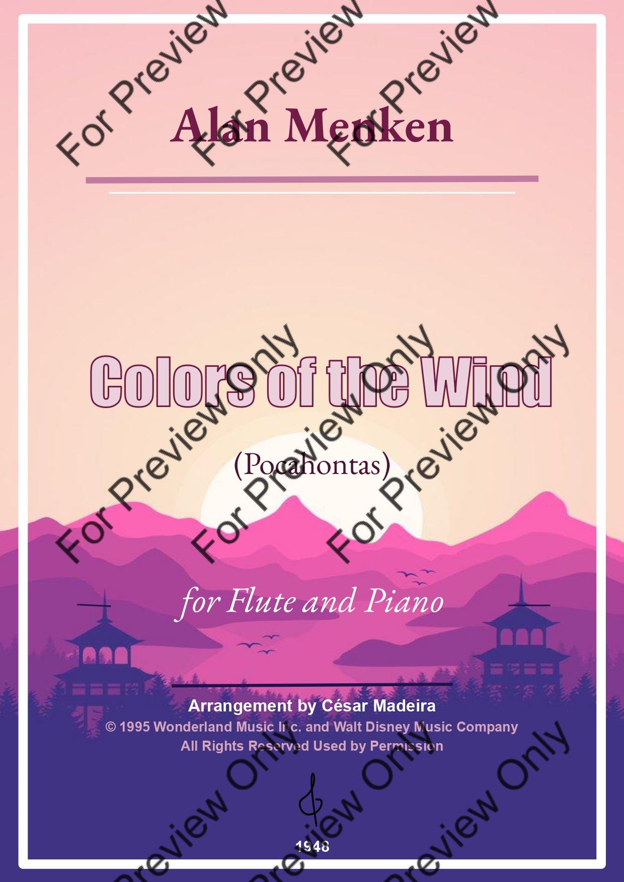 Colors Of The Wind (from Pocahontas) by Alan Menken. Arrangement for Flute and Piano. With Full Score and Individual Parts. Have fun!