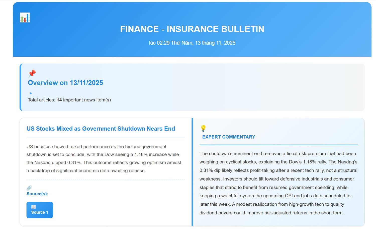 - Automatically collects finance, stock market, and insurance news from multiple sources (RSS or website HTML)