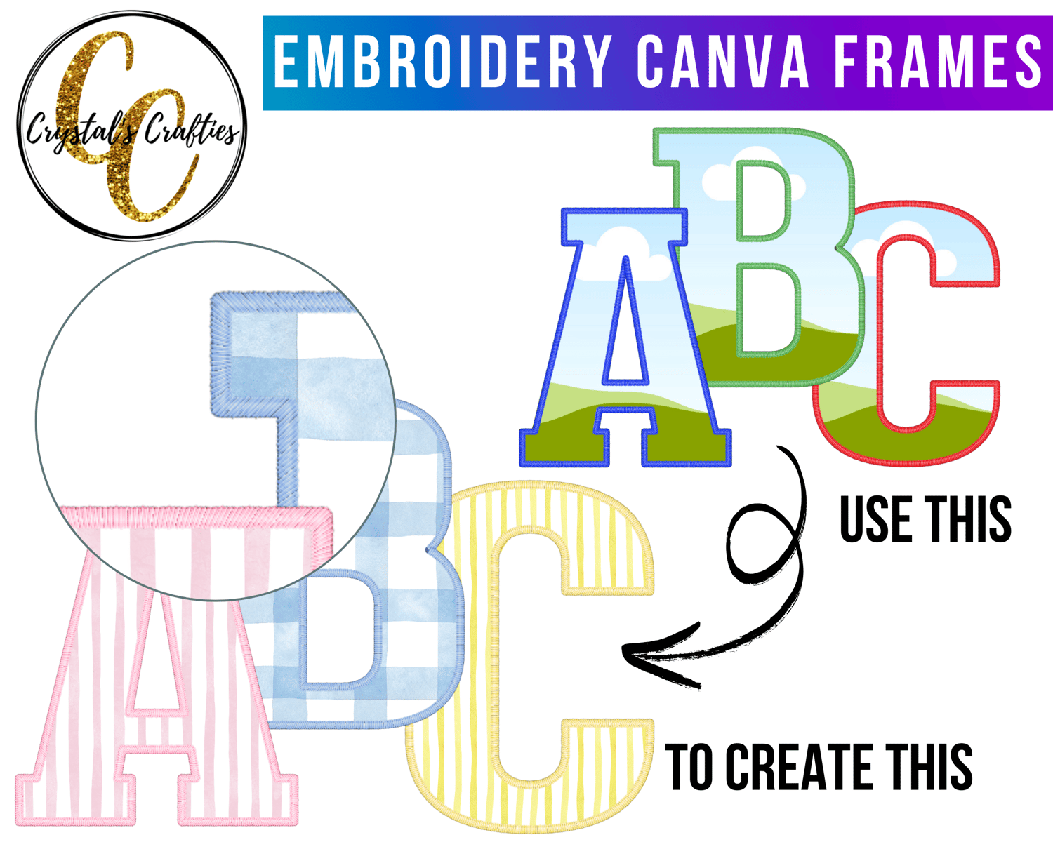 ✔️ A full uppercase embroidery alphabet (A-Z) in Canva frame format