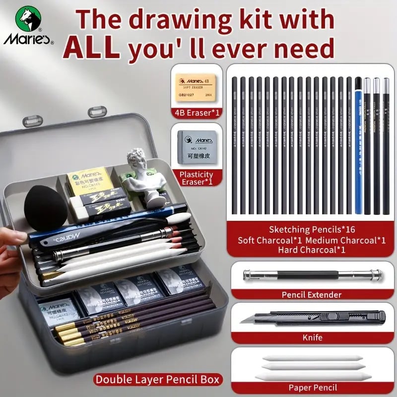 يحتوي على مجموعة أدوات فنية مع أقلام الفحم ؛ الرصاص، الممحاة، الكاتر ، أقلام الورق ، الطلاء، الكتابة والرسم