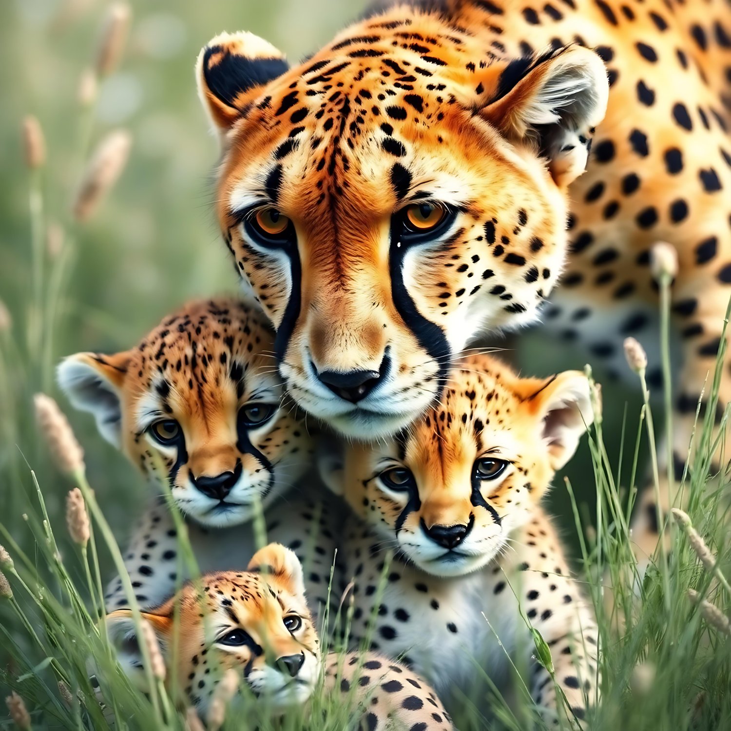 This beautiful photograph captured a cheetah with her cubs. The photograph will be printed on Hahnemühle gallery fine print paper. The size is A2 (420mm x 594mm)