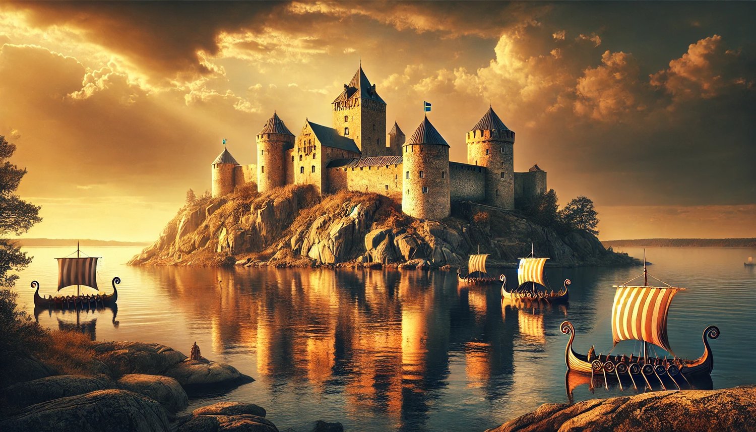 The surrounding waters are filled with Viking longships, their striped sails catching the sunlight as they navigate towards the fortress. The scene is framed by rugged shorelines and windswept trees, reinforcing the fortress’s dominance over its natural landscape. The reflections of the fortress and ships in the still water add a sense of tranquility, balancing the grandeur of the fortress with the peacefulness of the Nordic wilderness.