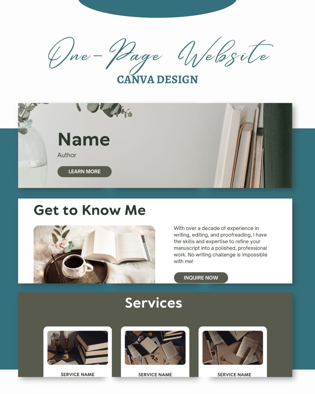 This One-Page Website Template is built in Canva and designed specifically for editors and publishing professionals who want a clean, professional online presence to showcase their services, testimonials, contact info, and more. Perfect for freelance editors, proofreaders, and publishing consultants building their brand.