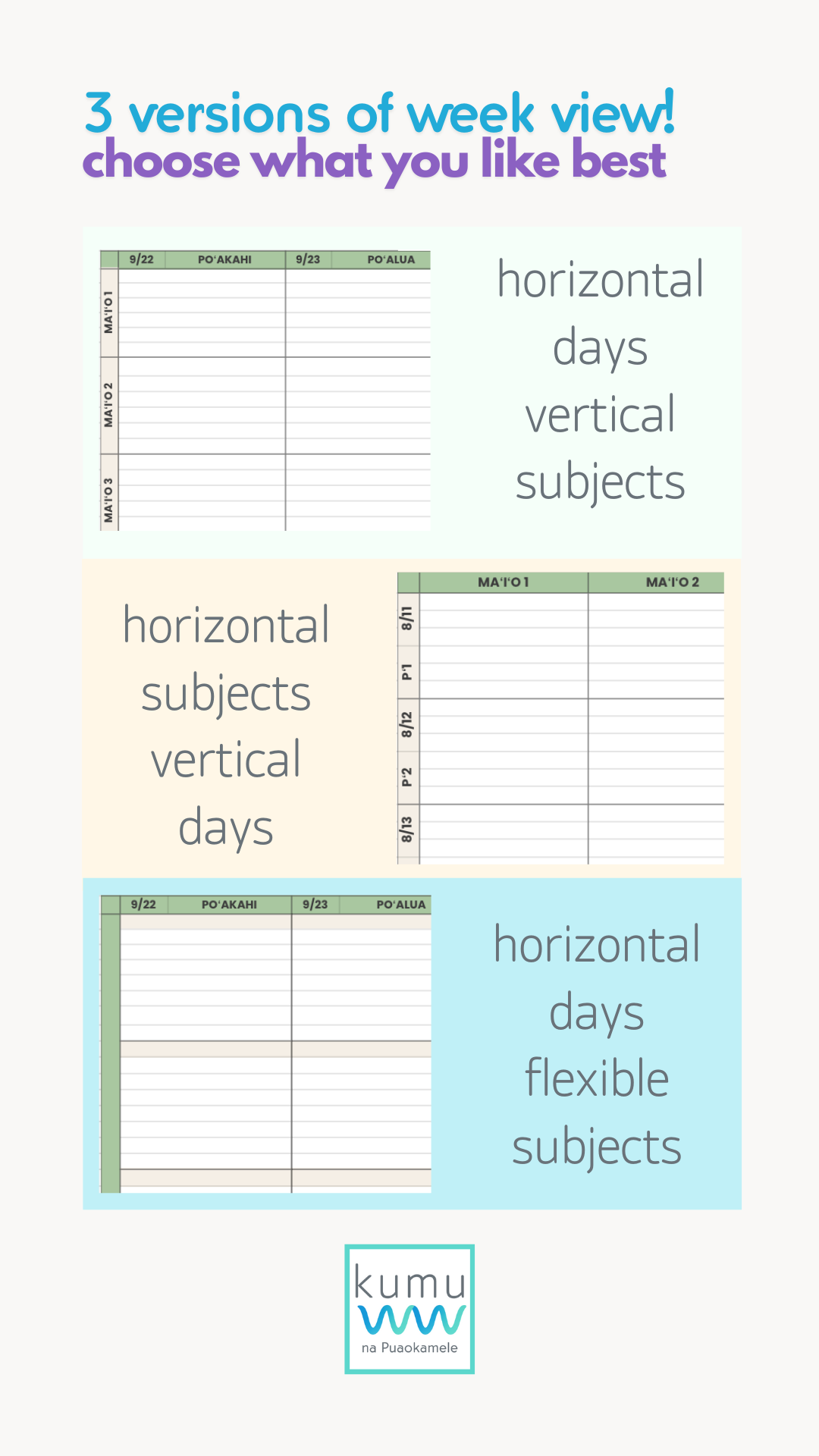 This resource is designed for Hawaii educators and those looking for planning tools in the Hawaiian language. Includes yearly, weekly, and monthly views, and is compatible with Google Sheets.