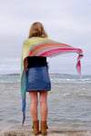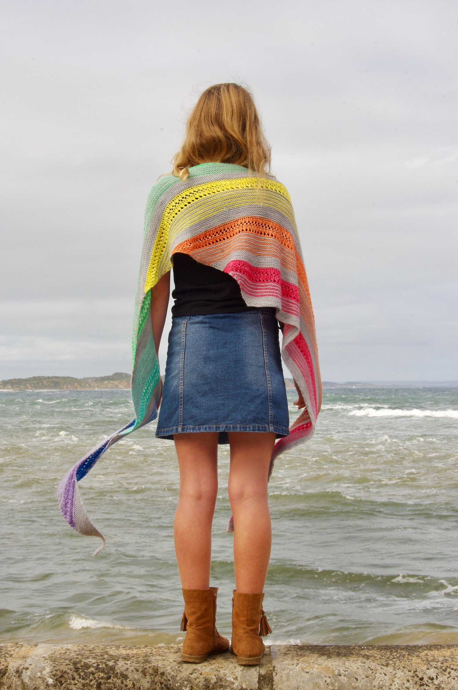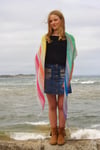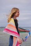 Kindled is an asymmetrical triangular-shaped shawl worked in garter, stripes and simple lace; perfect for using up mini skeins and left over odds and ends.