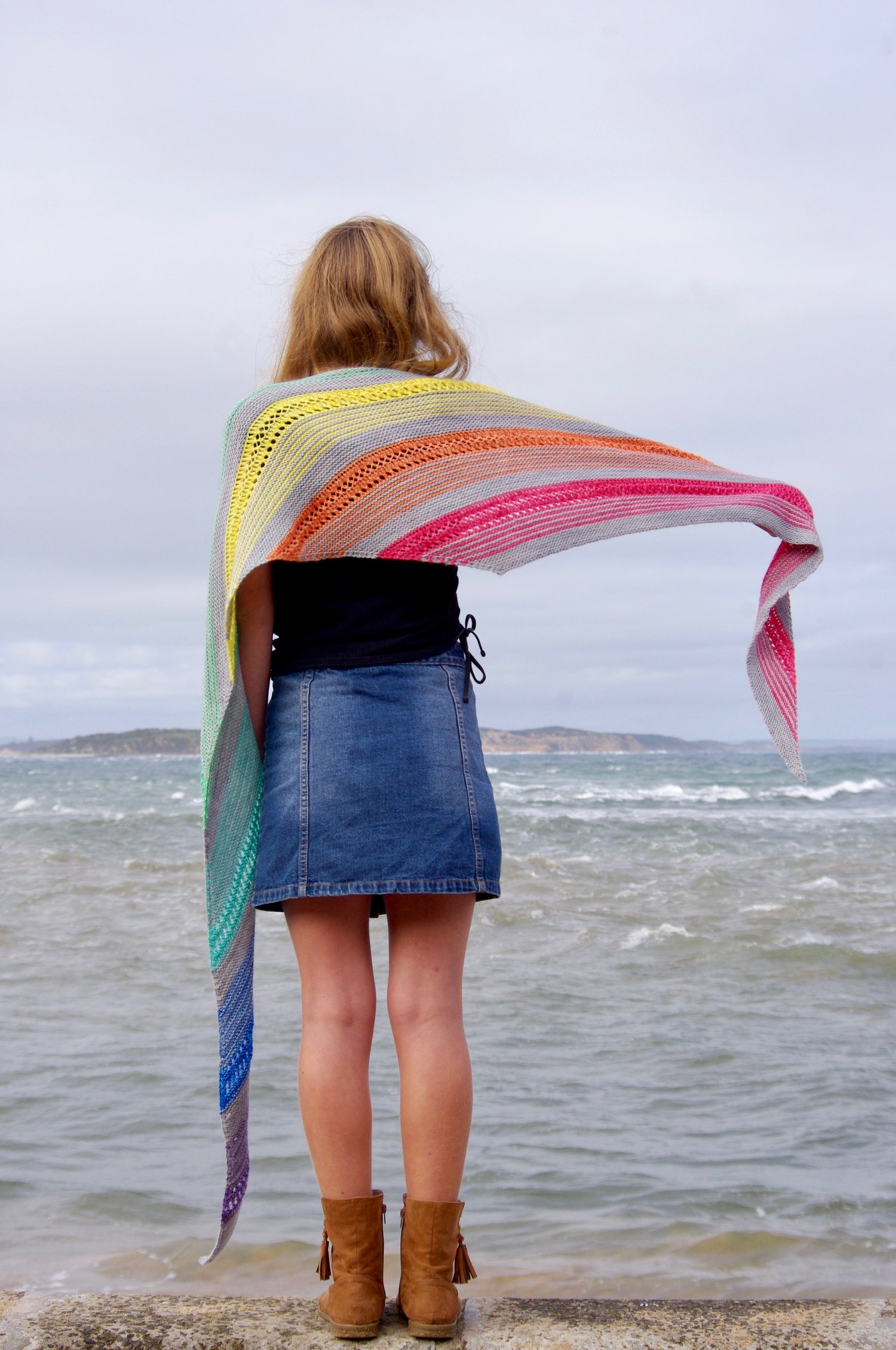 Sample uses Circus Tonic Handmade in ‘Sabine’s Gull’ as the Main Colour and Gradient Esplanade Fingering (discontinued) in ‘Colour Me Happy’ mini-skein set as the Contrast Colours.