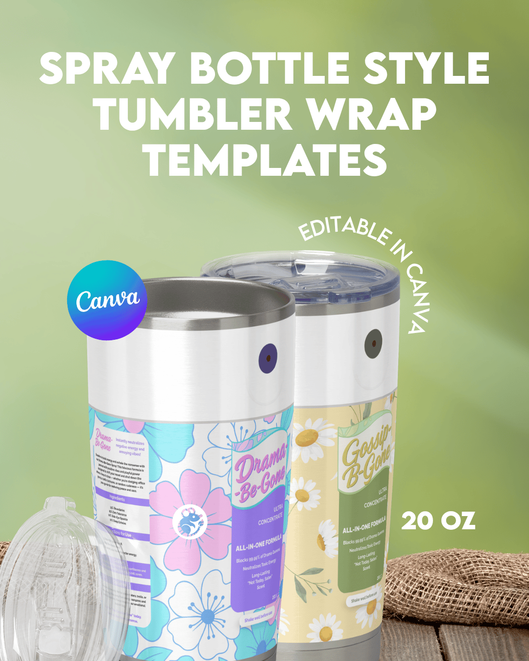 Spray Bottle Tumbler Wrap Template | 20oz Funny Canva Wraps for Sublimation | Editable Digital Download | Drama Be Gone & Gossip B Gone