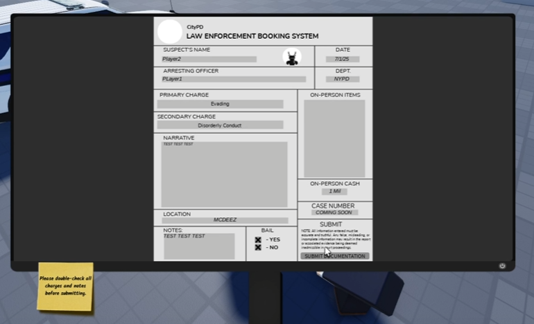 A realistic and fully modular law enforcement system built for Roblox roleplay communities. Includes drag-and-drop arrest tools with animations and UI prompts, a complete suspect booking interface with Discord webhook integration, jail team assignment, jail time calculation from charges, bail support with in-game or Robux options, and automatic jail restoration using DataStore.