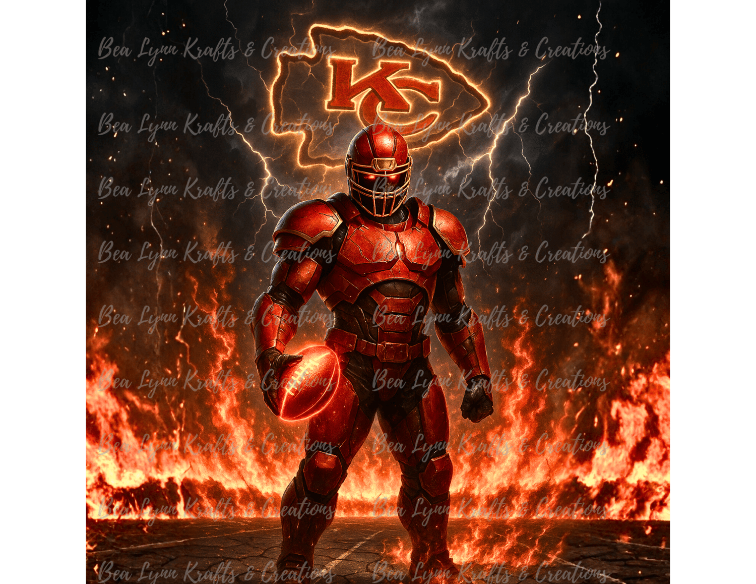🔥 Step into the flames of victory with these two electrifying Kansas City Chiefs Warrior PNGs — one half-body close-up and one full-body stance. Drenched in bold red armor and holding a glowing football, this futuristic gridiron gladiator stands ready in front of blazing infernos and thunderous skies. The iconic KC arrowhead logo blazes overhead, etched in lightning and power.