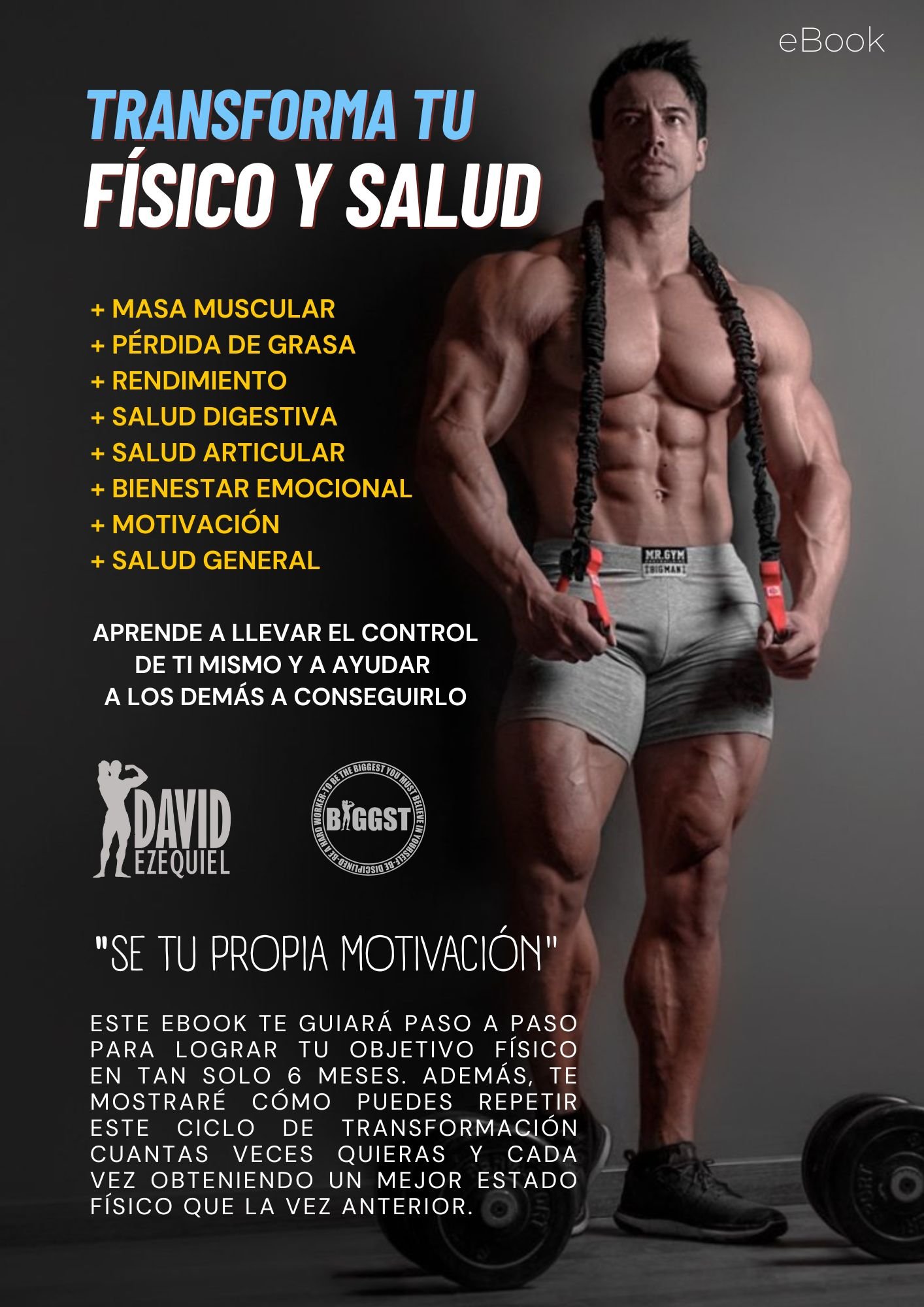 Con el eBook "Transforma tu físico y salud" aprende a controlar tu alimentación y entrenamiento de manera efectiva. Comienza a transformar tu físico desde el primer mes obteniendo una transformación espectacular cada 6 meses. Además mejora tu estado anímico, motivación y autoestima, tu digestión, tu salud articular, calidad del sueño, y mucho más. Aprende a calcular la cantidad precisa de macronutrientes y descubre alimentos de calidad para alcanzar tus objetivos de manera eficiente. Comienza hoy tu transformación y disfruta los beneficios de ser tu propio nutricionista y entrenador personal.