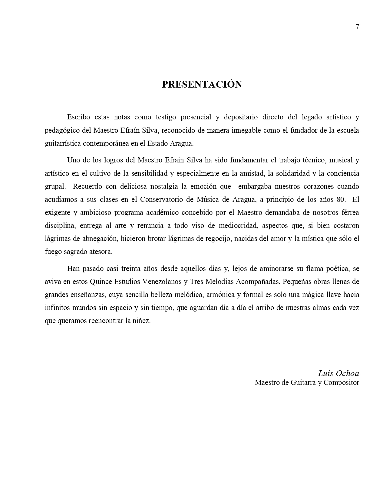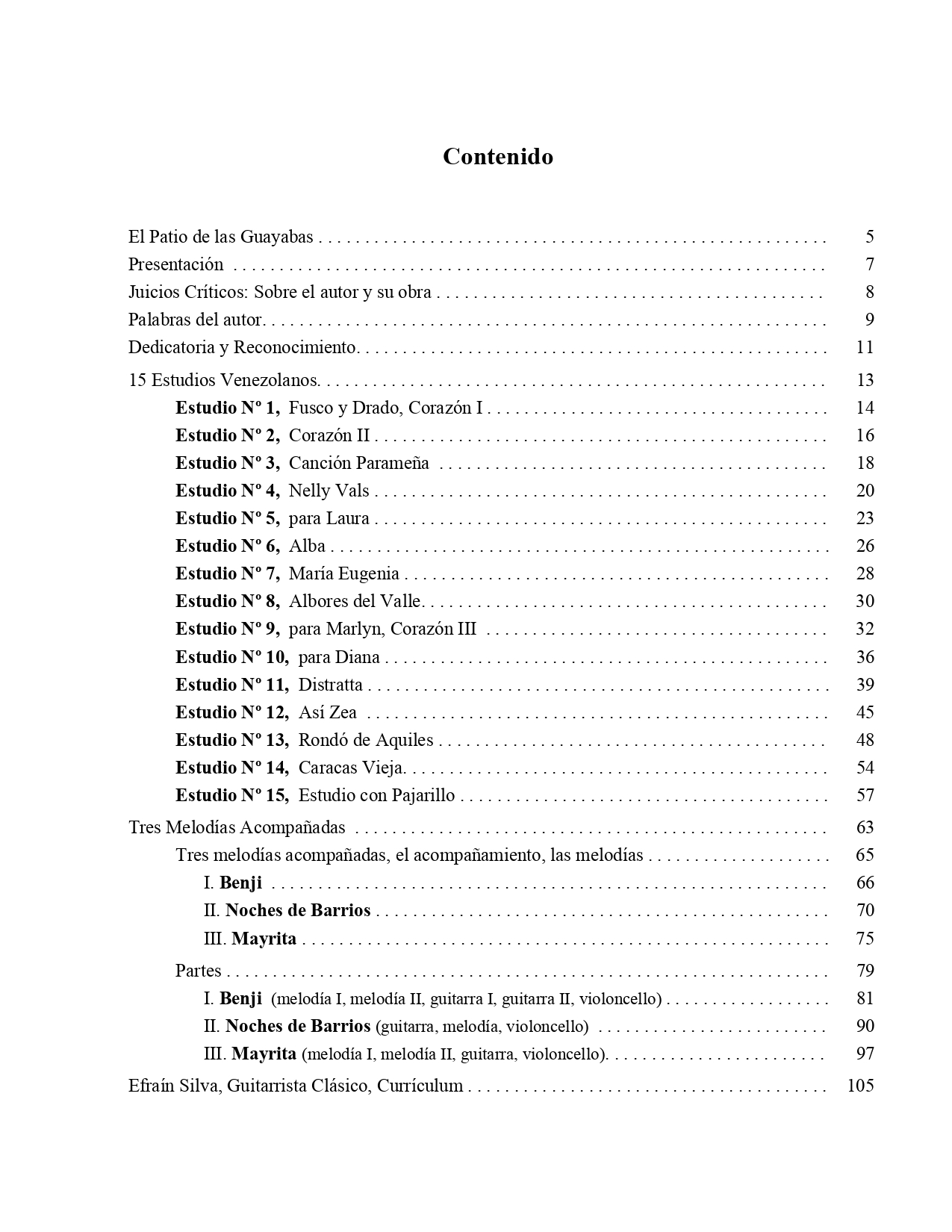 Each study has been composed with a dual purpose: to solve specific technical guitar problems and, at the same time, immerse the student in the aesthetics and phrasing of Venezuelan music (Waltz, Merengue, Pajarillo).