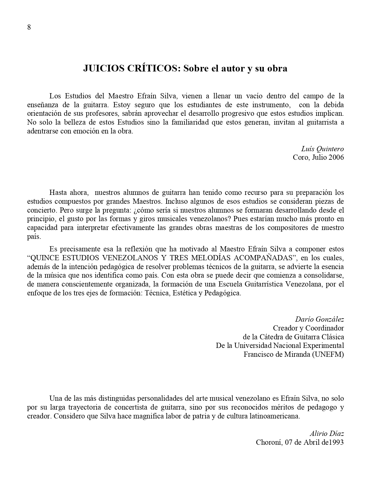 "Not only the beauty of these Studies, but the familiarity they generate, invite the guitarist to delve into the music with emotion." — Luis Quintero.