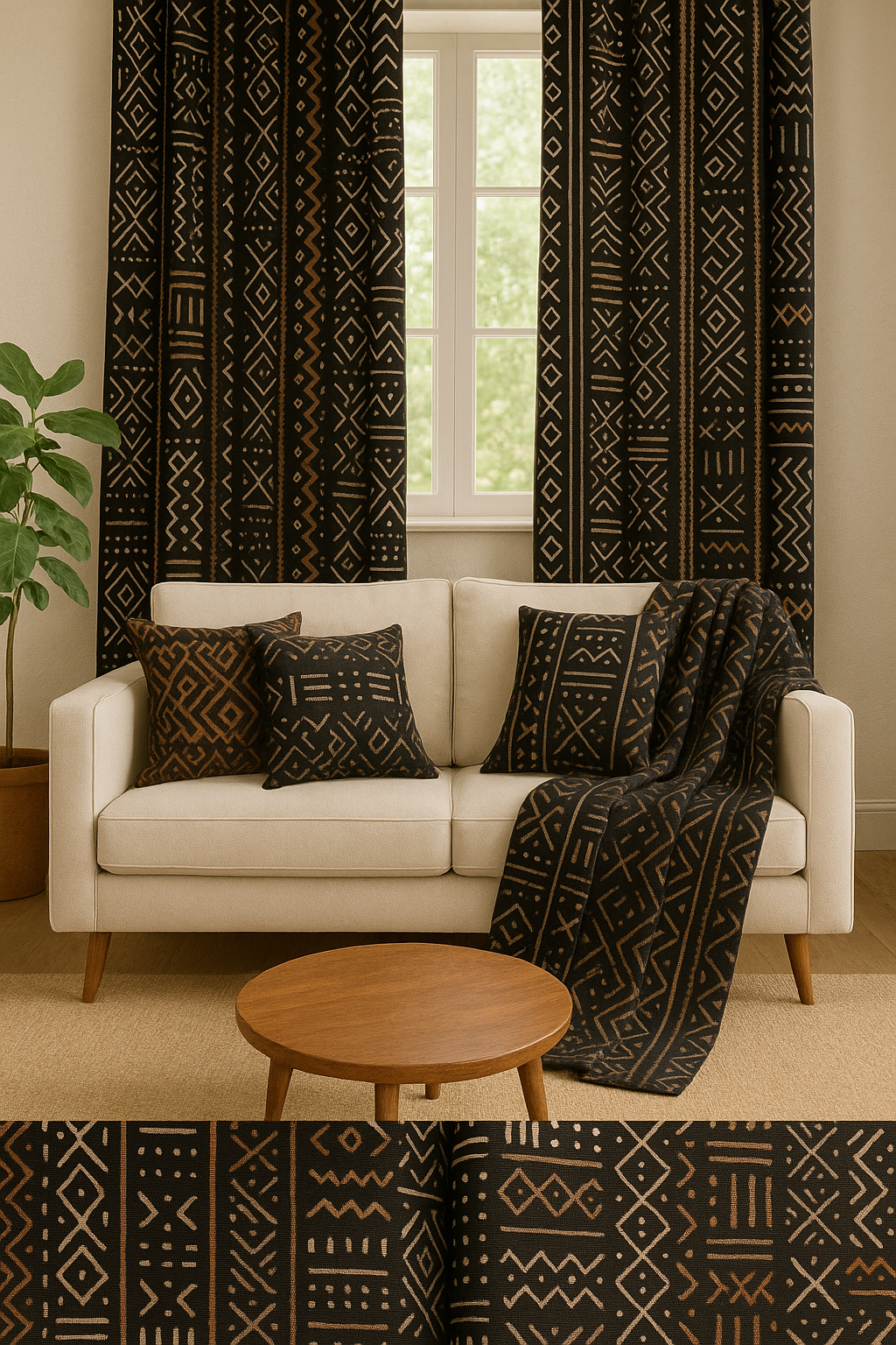 Afrocentric Mudcloth Home Decor Set – Curtains, Throw Pillows & Blanket | Boho African Living Room Style