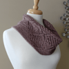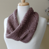 This garter stitch and lace cowl is a quick project worked in one skein of worsted weight yarn. The cowl is worked in the round with the lace lattice design being repeated three times. Every second row is knit, making this a fast and easy project to complete.
