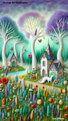 Whimsical fairy houses in a misty green forest with tall white twisty trees. There are poppies & sunflowers & a tiny whimsical white fox beside a sparkling lake. There are beautiful birds.